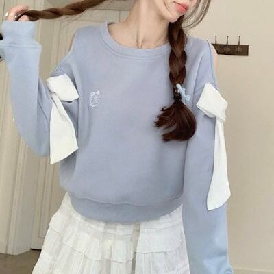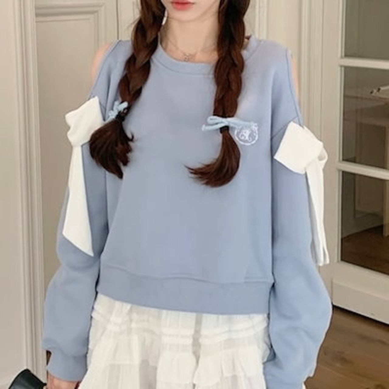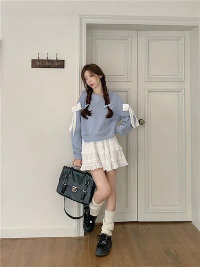 2024秋冬トップス ラウンドネック 長袖 ゆったり 秋 水色 青 ブルー おしゃれ かわいい ラブリー キュート 韓国ファッション オフ レディース お出かけ