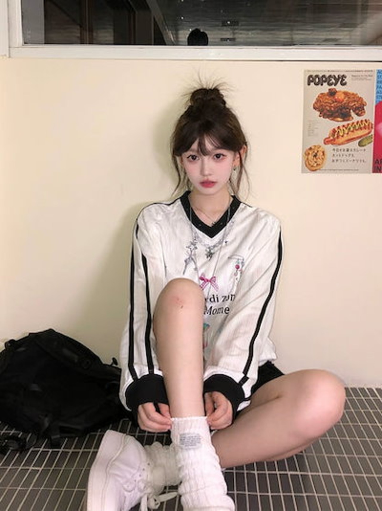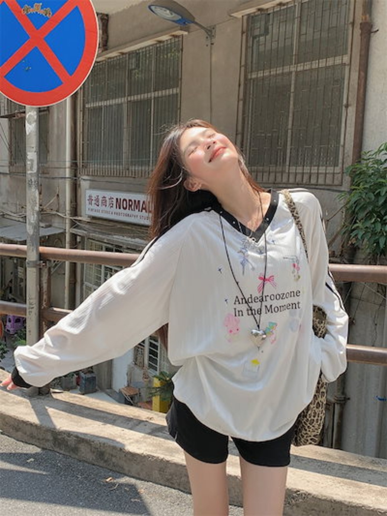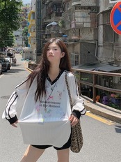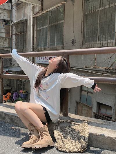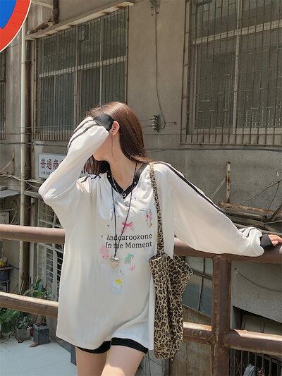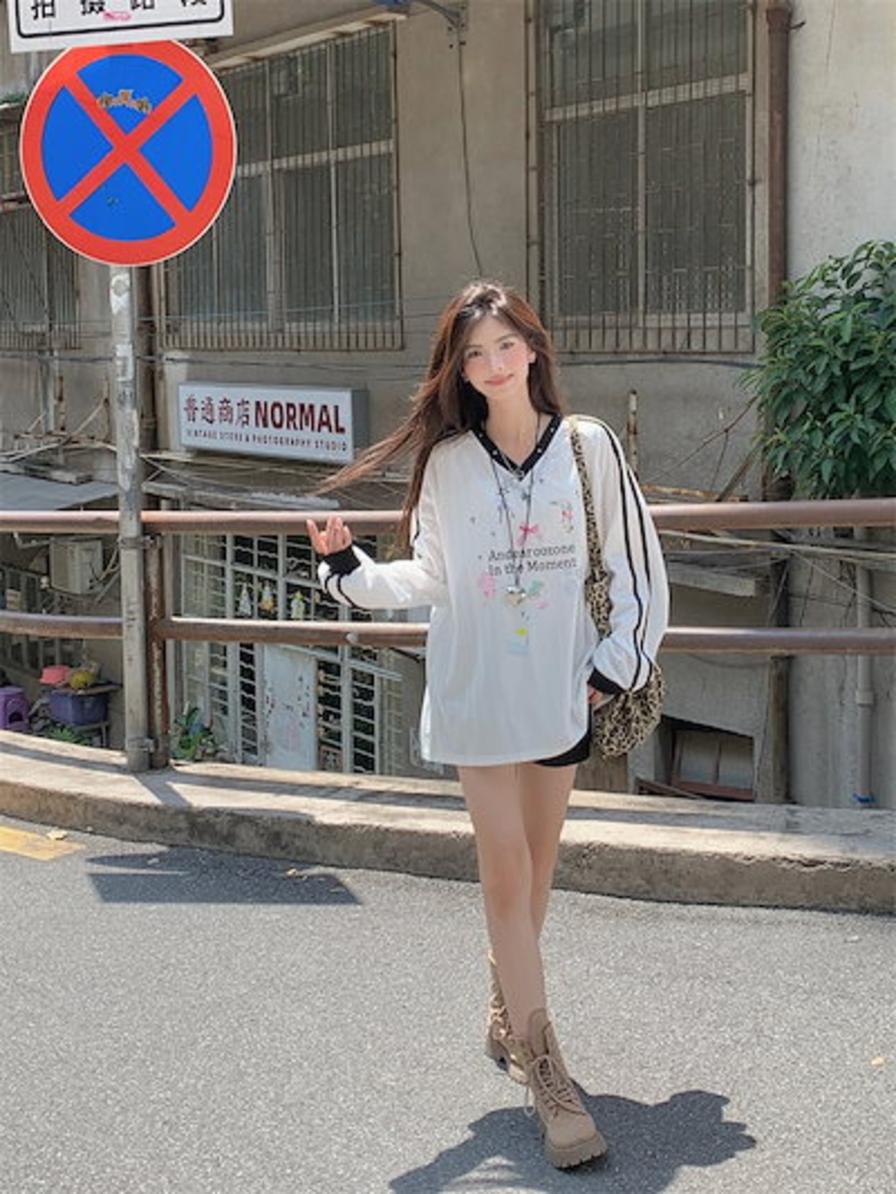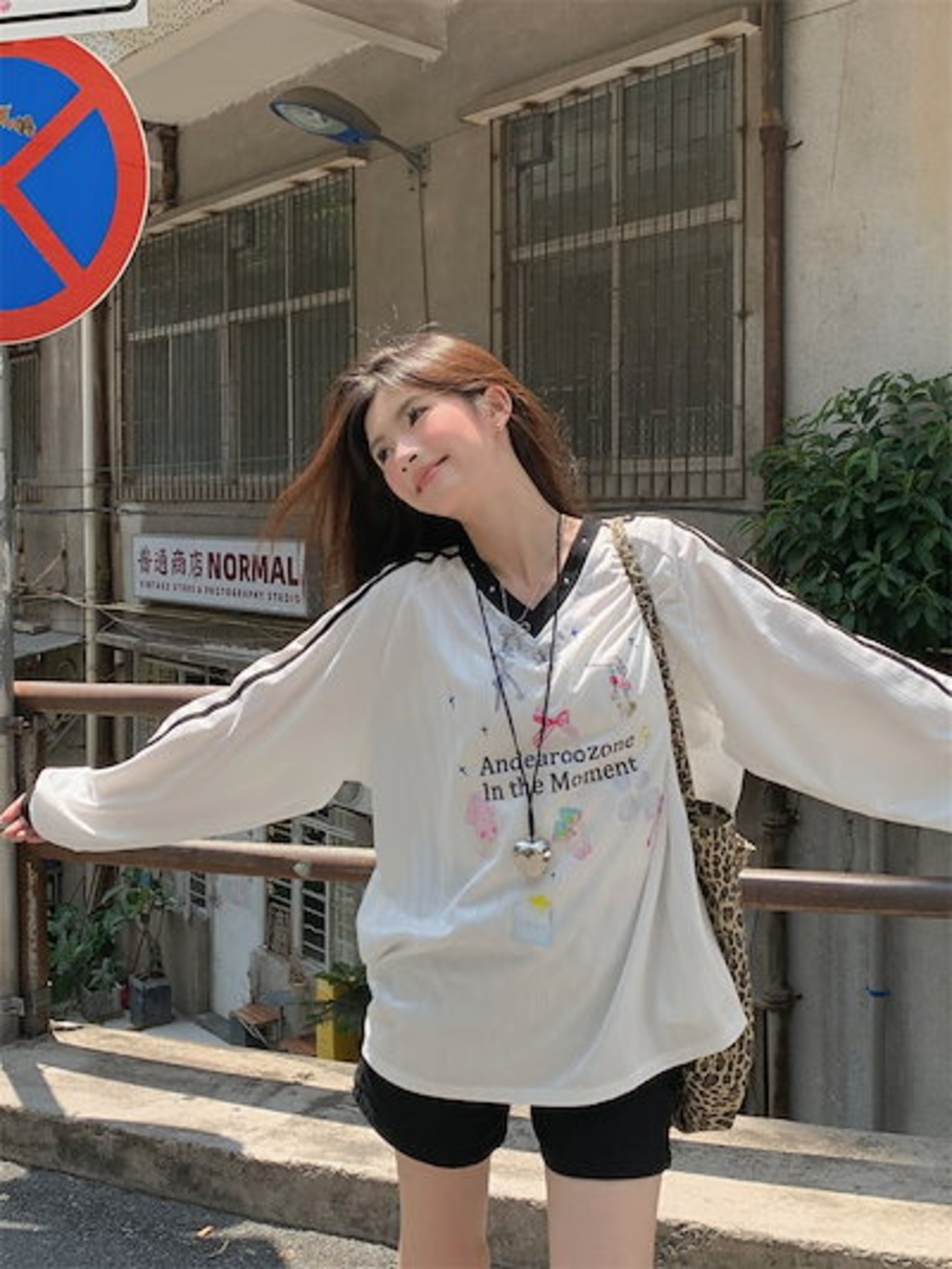 2024 秋冬 トップス 長袖 かわいいVネック Tシャツ レディース 韓国風 ロゴ衣装ルーズ ゆったりカジュアルおしゃれサイズスリーブシルエットファッション系サイドシャツフットスウエット春