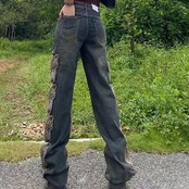 ファッションジーンズ女性レトロトレンドハイウエスト刺繍ルーズドラッググラウンドバタフライホローワイドレッグパンツ