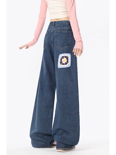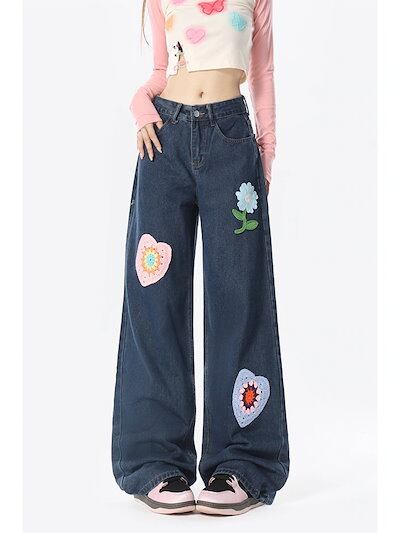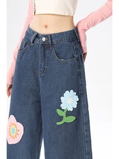 ブルージーンズ レディース 刺繍 ハイウエスト ルーズストレート カジュアル ワイドレッグ ロングパンツ