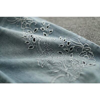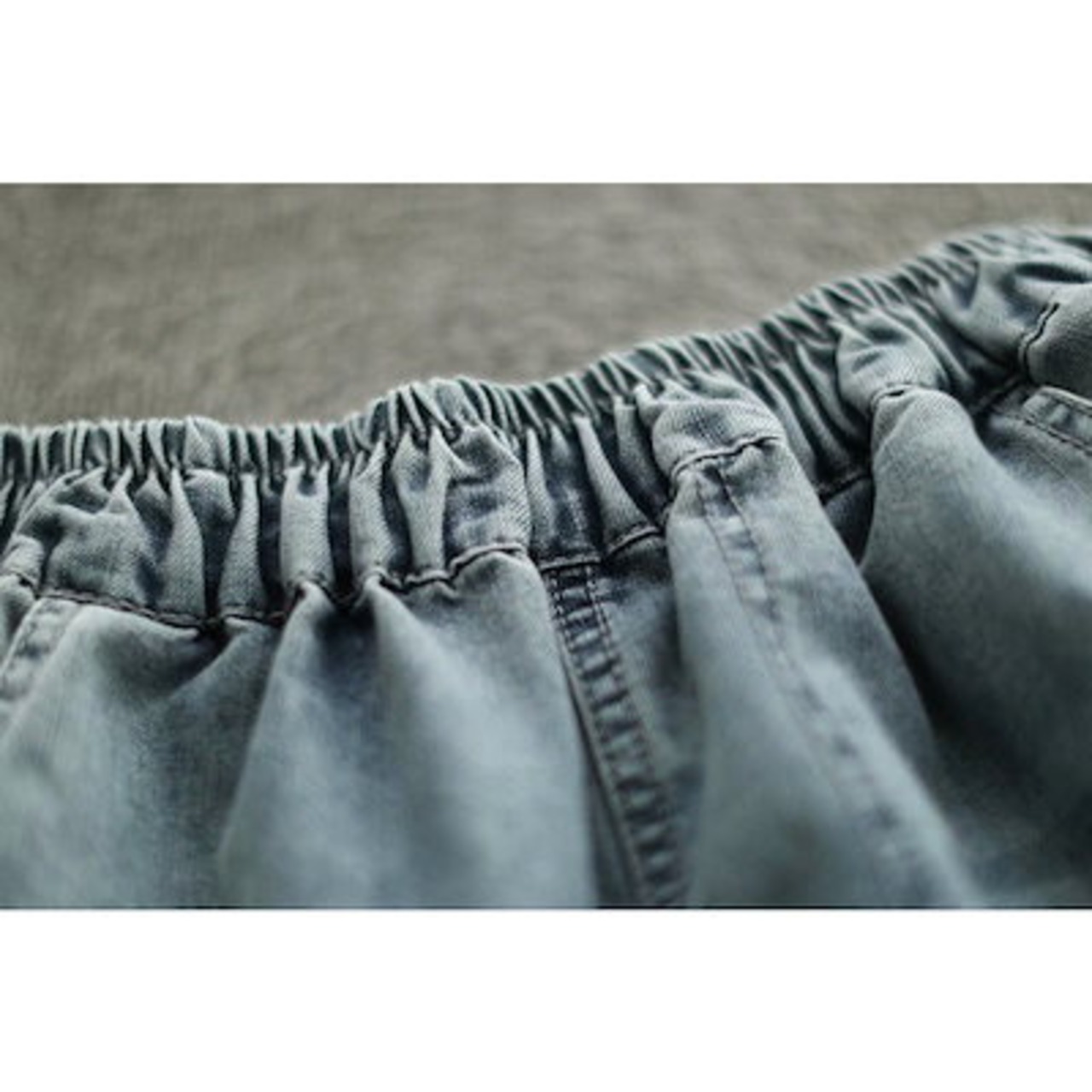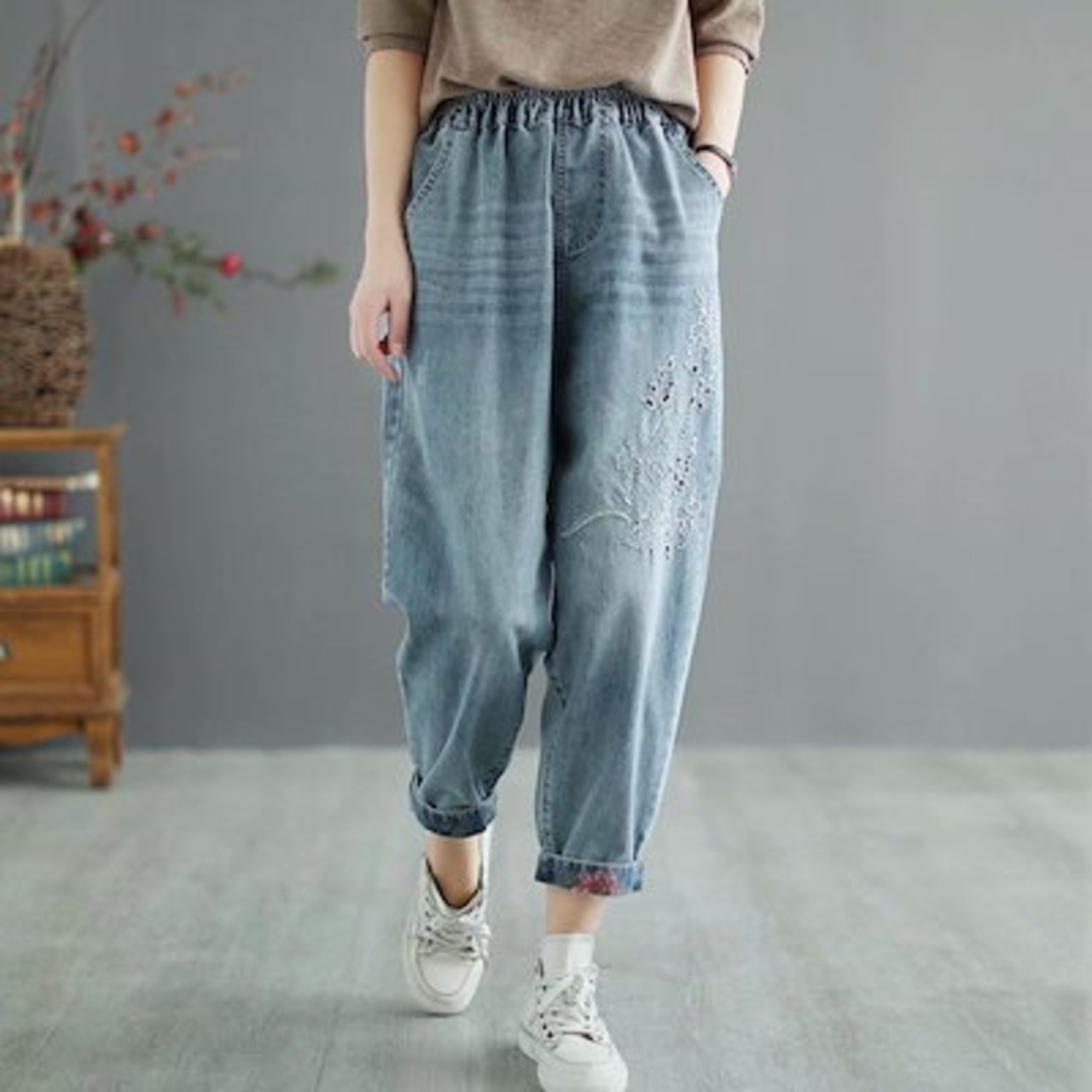 サルエルパンツデニムパンツ刺繍花柄レディースGパンゆったりカジュアルガウチョ30ウエストゴムワイドおしゃれ体型カバー