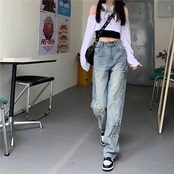 デザイン感 ジーンズ ハイウェスト ゆったり カラー刺繍 ロングパンツ ストレート ジーンズ ペンタグラムスター カーゴパンツ