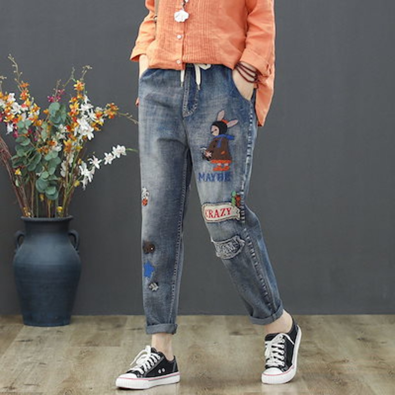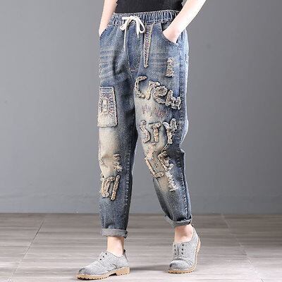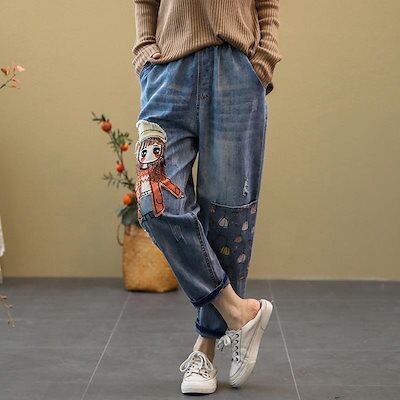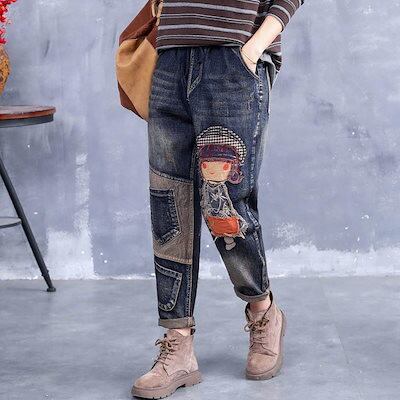 【】漫画ガール ワッペン 刺繍 ジーンズ レディース ゆったり 大きいサイズ ビッグポケット ウエストゴム ハーレムパンツ