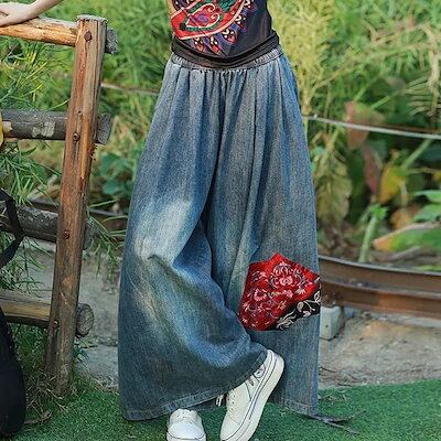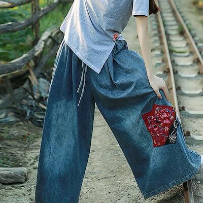 エスニック風刺繍ジーンズ女性2023ゆったりビッグパンツ裾見せハイジーンズ刺繍ファッションワイドレッグパンツ 母の日