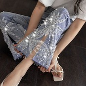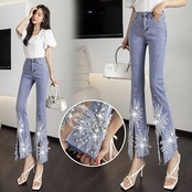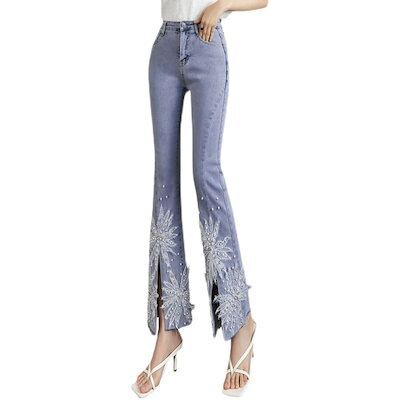 春夏ビーズジーンズレディースハイウエストスリムフィットスリムスリットマイクロフレア九点刺繍パンツ 母の日