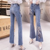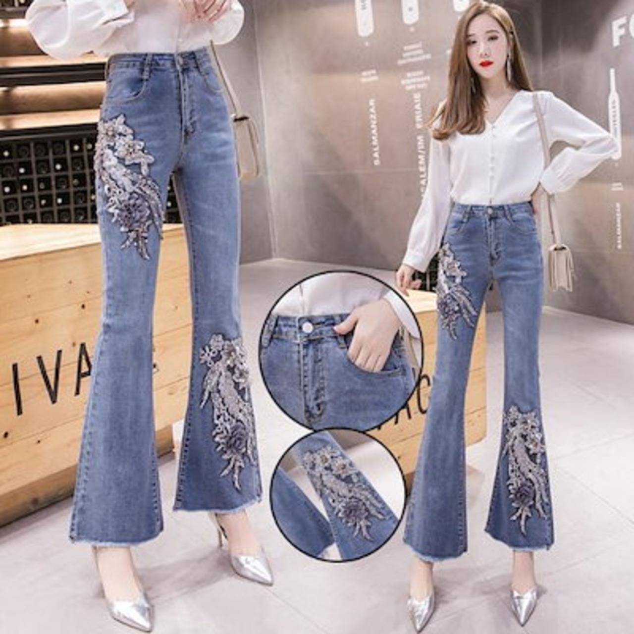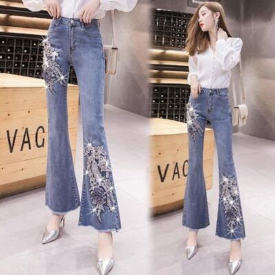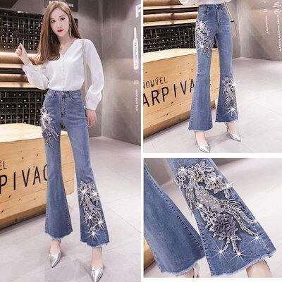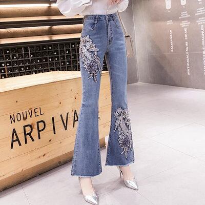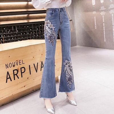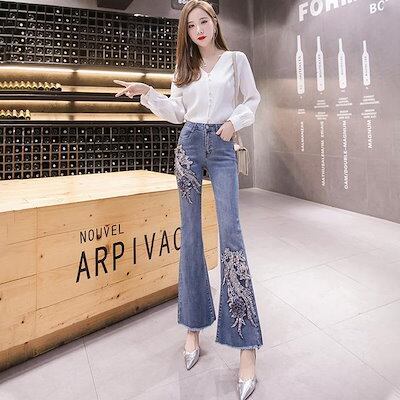 刺繍フレアジーンズレディース2023春秋ハイウエストスリムフィッシュテールパンツドレープややフレアパンツ九点パンツ 母の日