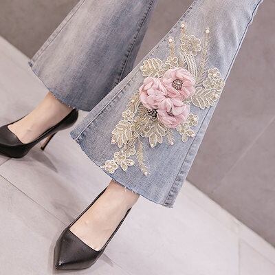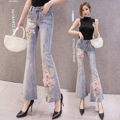 ビーズ刺繍フレアクロップドパンツレディース春秋韓版ハイウエストスリムストレッチジーンズフレアパンツスキニーストレッチジーンズフレアパンツ 母の日