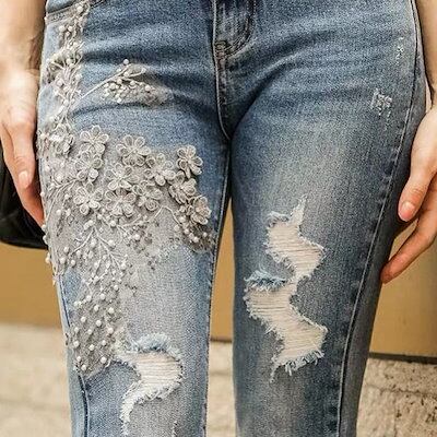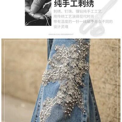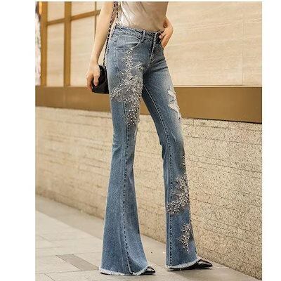 風フレアパンツハイウエスト生エッジスリムビーズ刺繍フレアジーンズレディーススリム&ロングパンツ 母の日