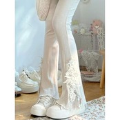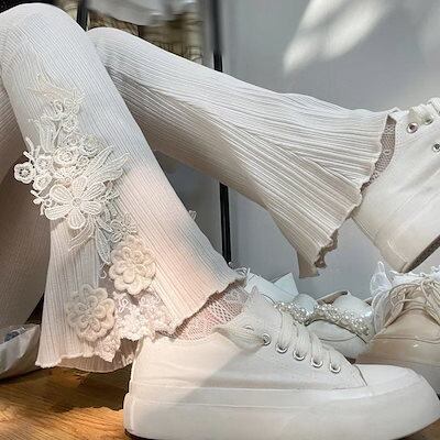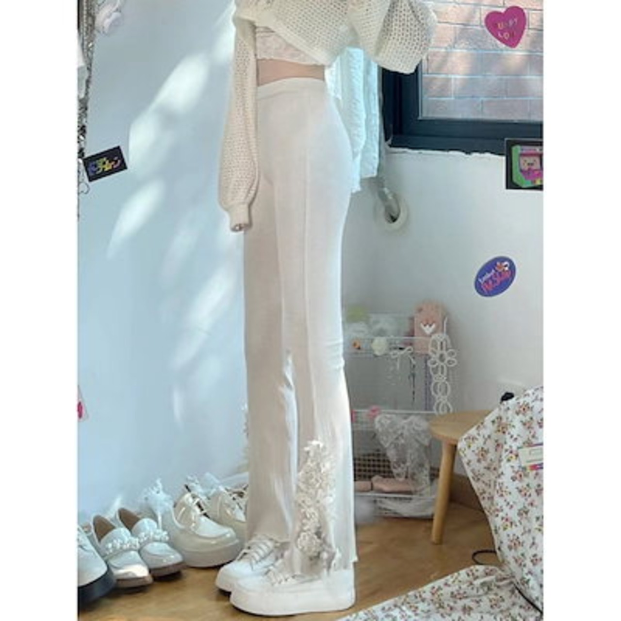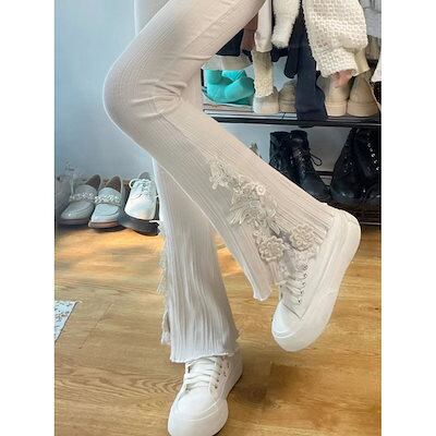 ハイウエスト花びら刺繍レースカジュアルパンツレディース2023年春夏ファッションピットストライプデザインマイクロフレアパンツ 母の日
