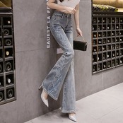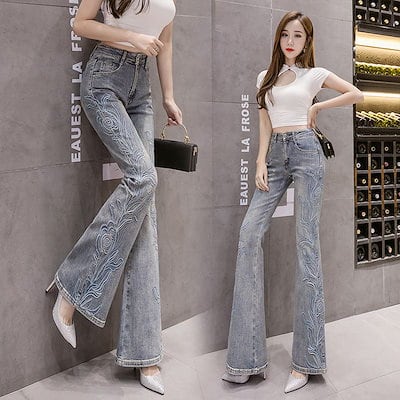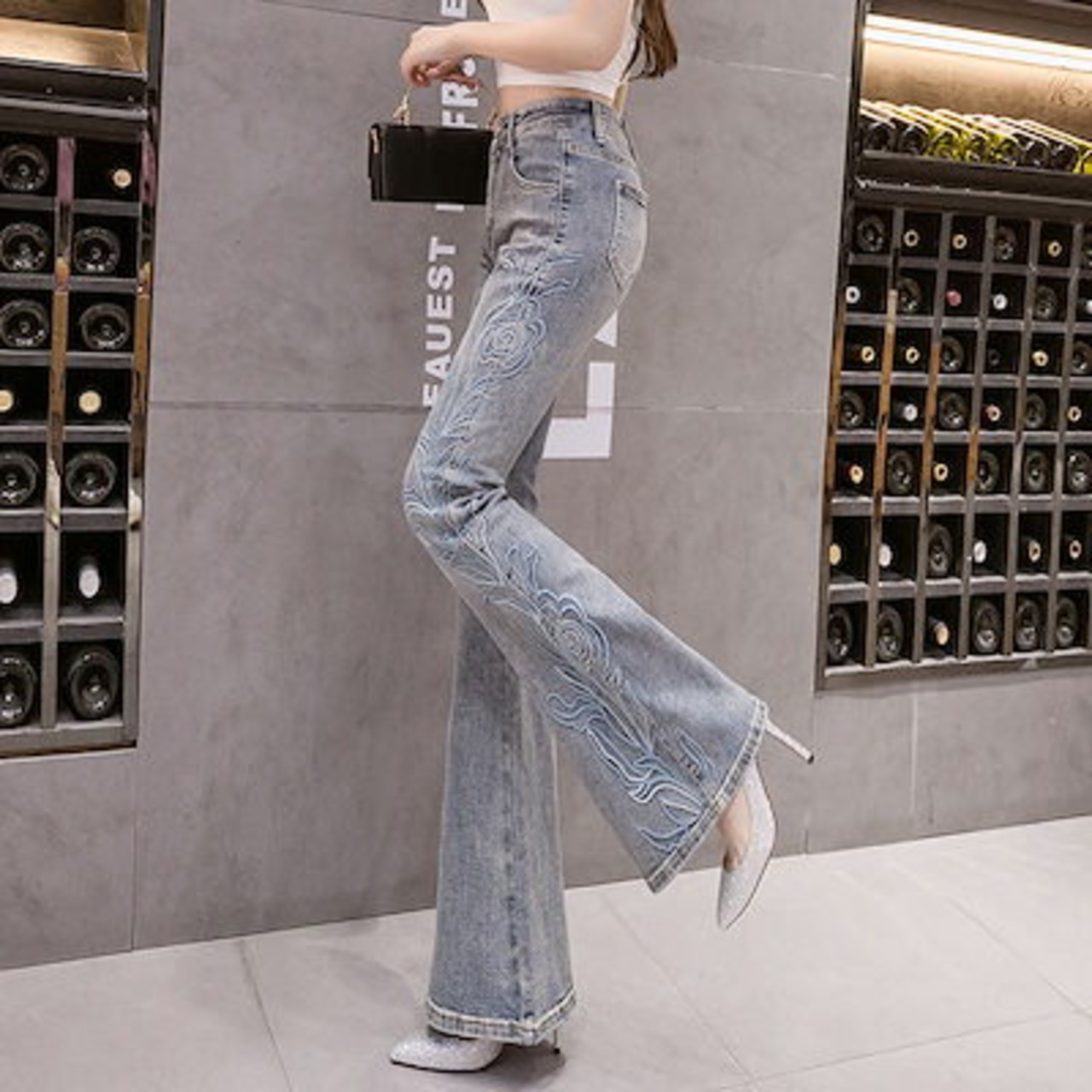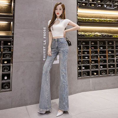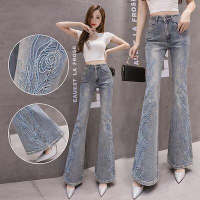 ハイウエスト フレア ジーンズ レディース 春 スリム フィット スリム レトロ ライト 刺繍 ワイドレッグ フレア パンツ ロング 母の日