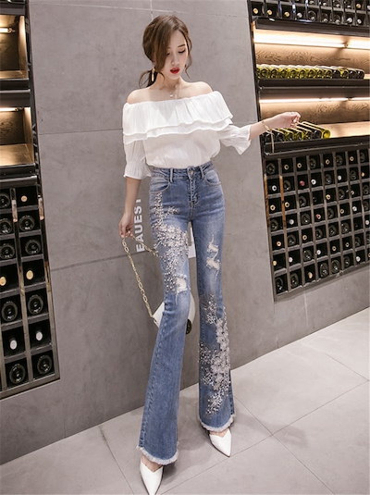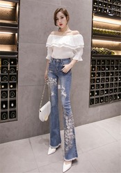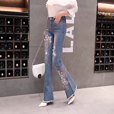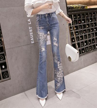 限量 全新 ファッション フレアジーンズ 女性 ハイウエスト 刺繍 フィッシュテール スリムフィット