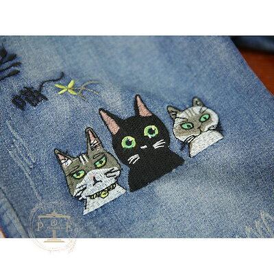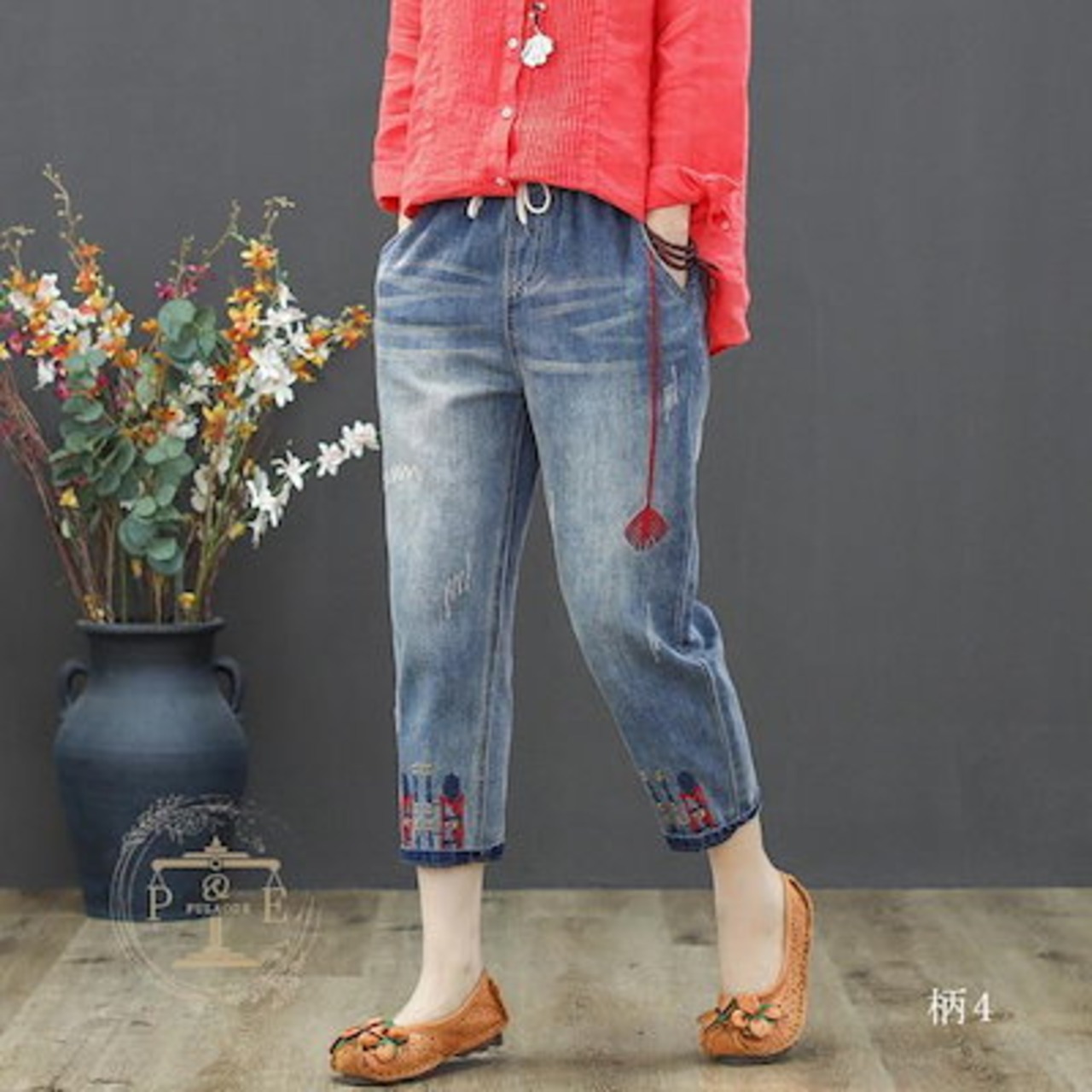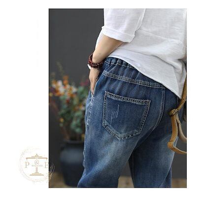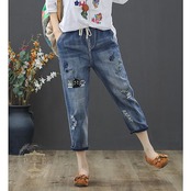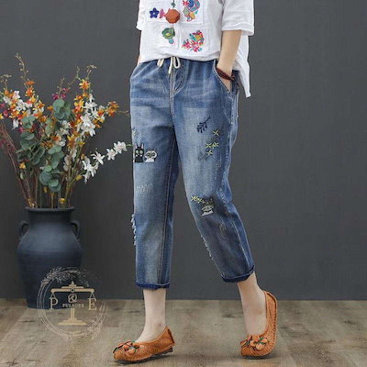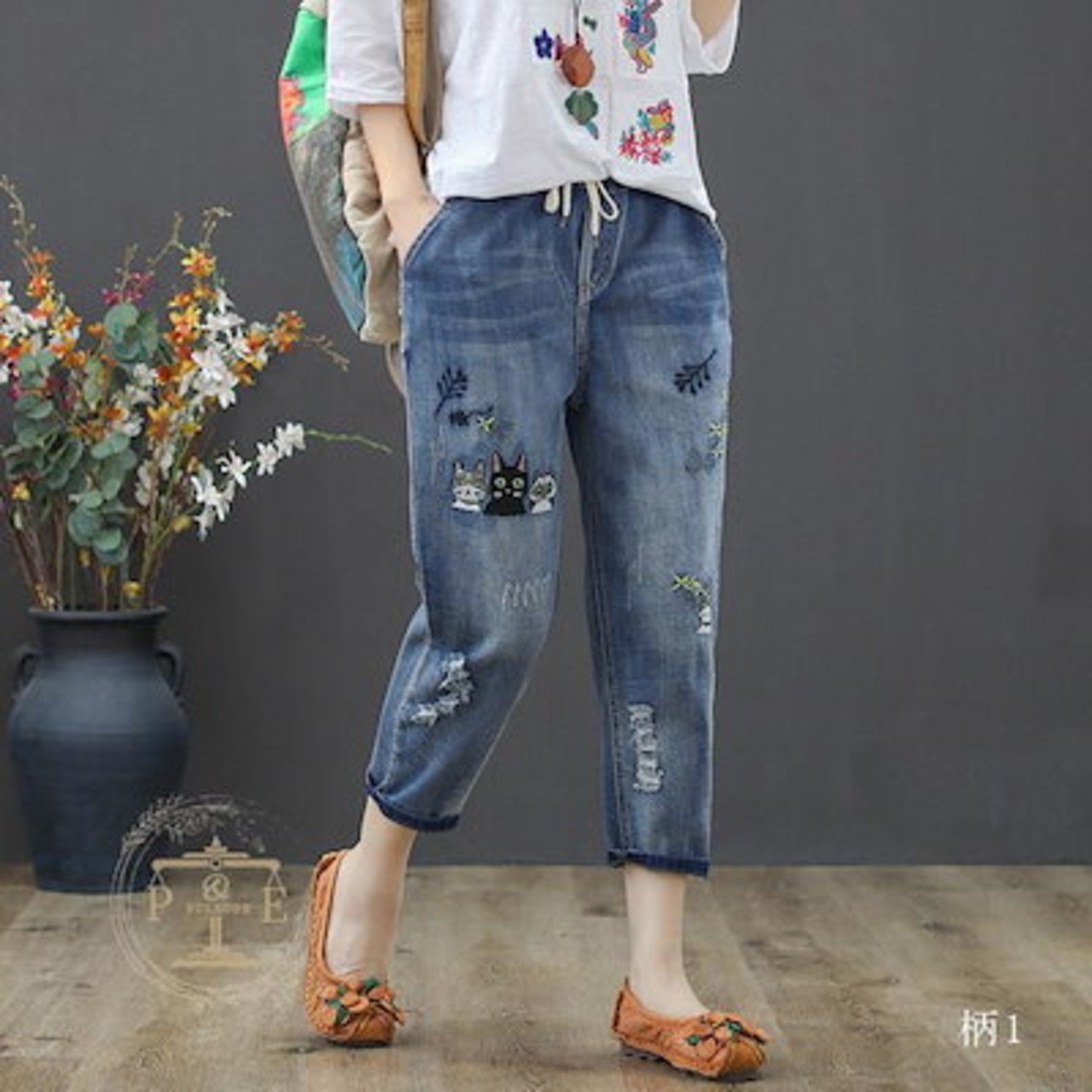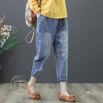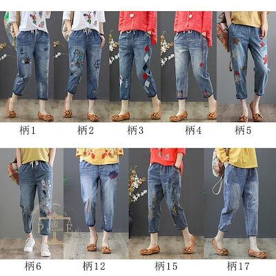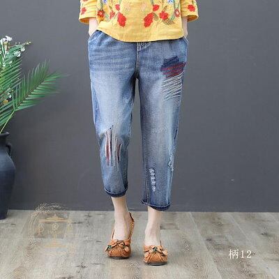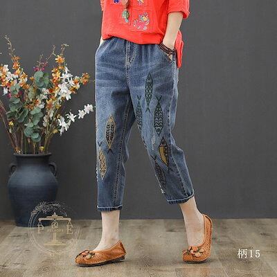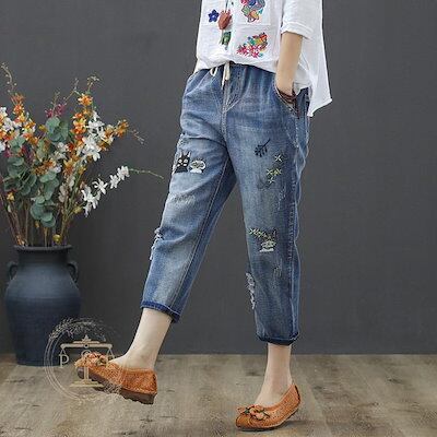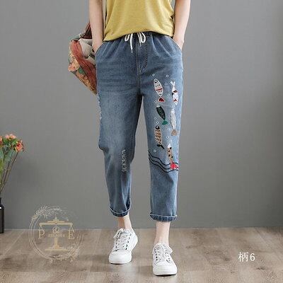 超目玉新品 ジーンズ 刺繍 猫 魚 花 フラワー クロップド デニムパンツ イージーパンツ 七分丈 ウォッシュ ダメージ レディース