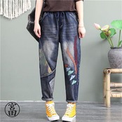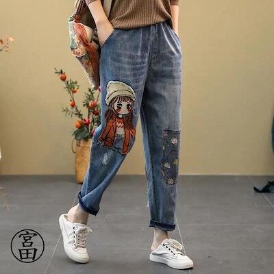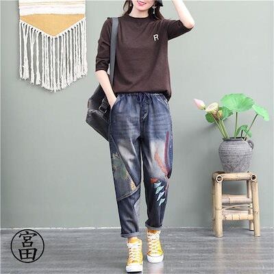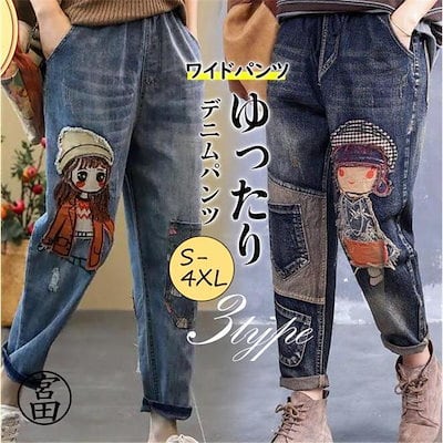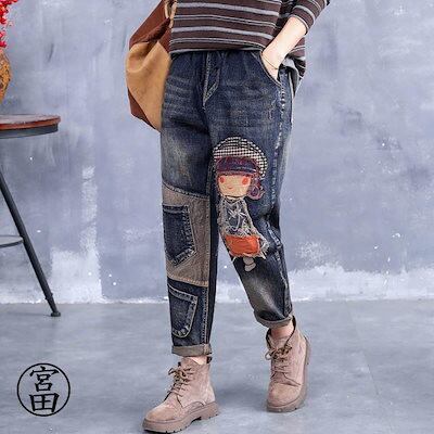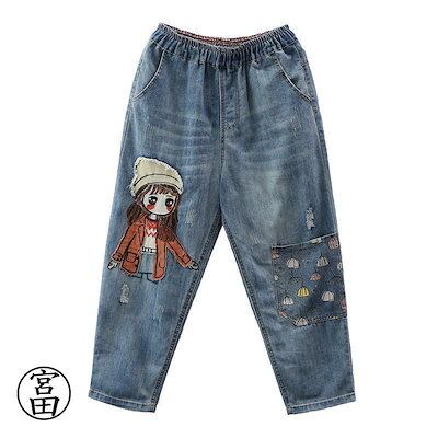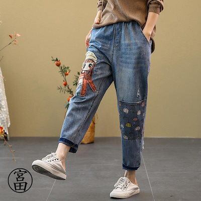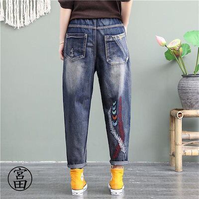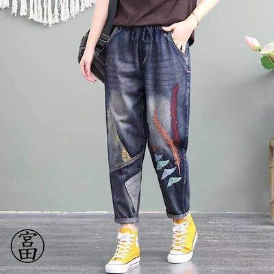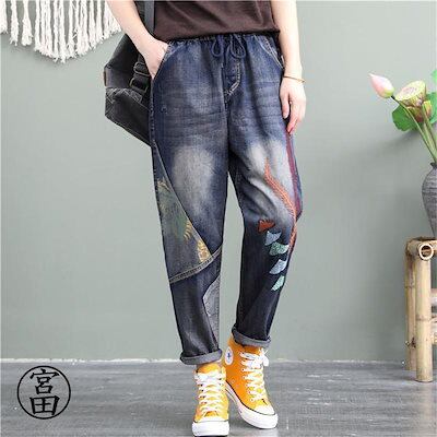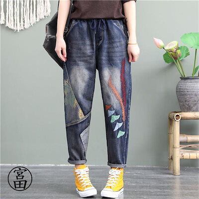 デニムパンツ レディース ワイドパンツ 森ガール風 ウゴム 刺繍花柄 カジュアル ストレッチ 大きい ゆったり 民族風 旅行 大人