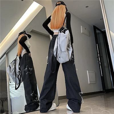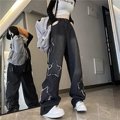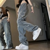 レディース スプリング ジーンズ スター刺繍 ハイウエスト ルーズ ストレート パンツ ウォッシュド ダメージ デザイン パンツ3