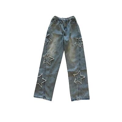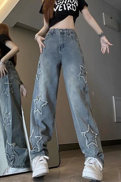 レディース スプリング ジーンズ スター刺繍 ハイウエスト ルーズ ストレート パンツ ウォッシュド ダメージ デザイン パンツ4