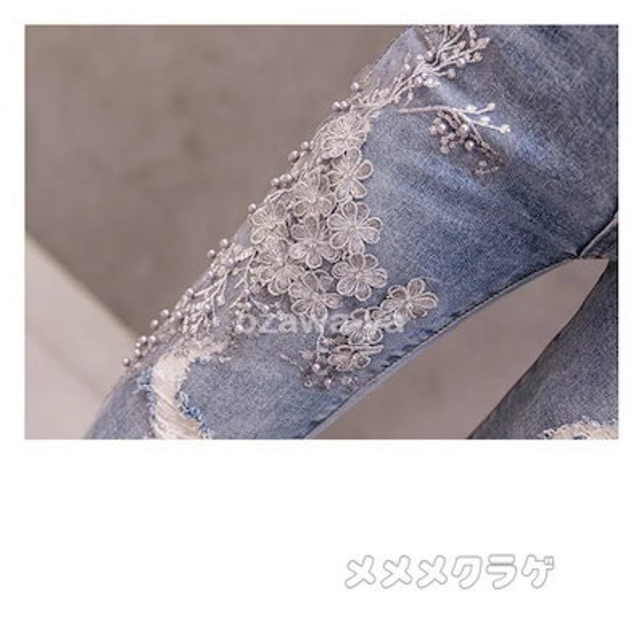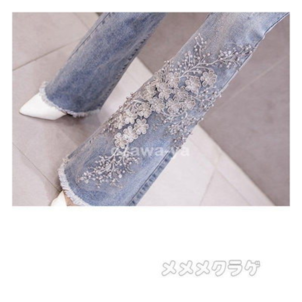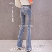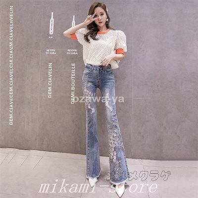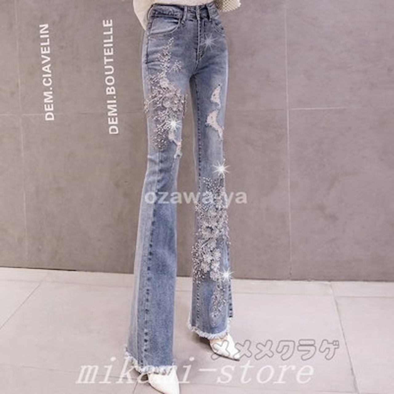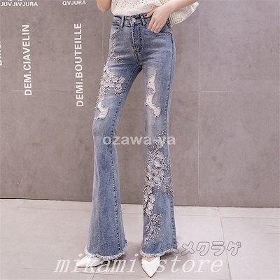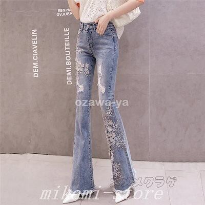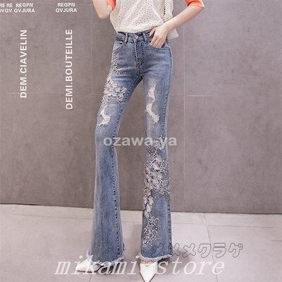 パンツデニムフレアパンツ刺繍大きいサイズレディースハイウエストポケット付き美脚裾フリンジ着痩せロングパンツデニムパンツ不規則きれいめ