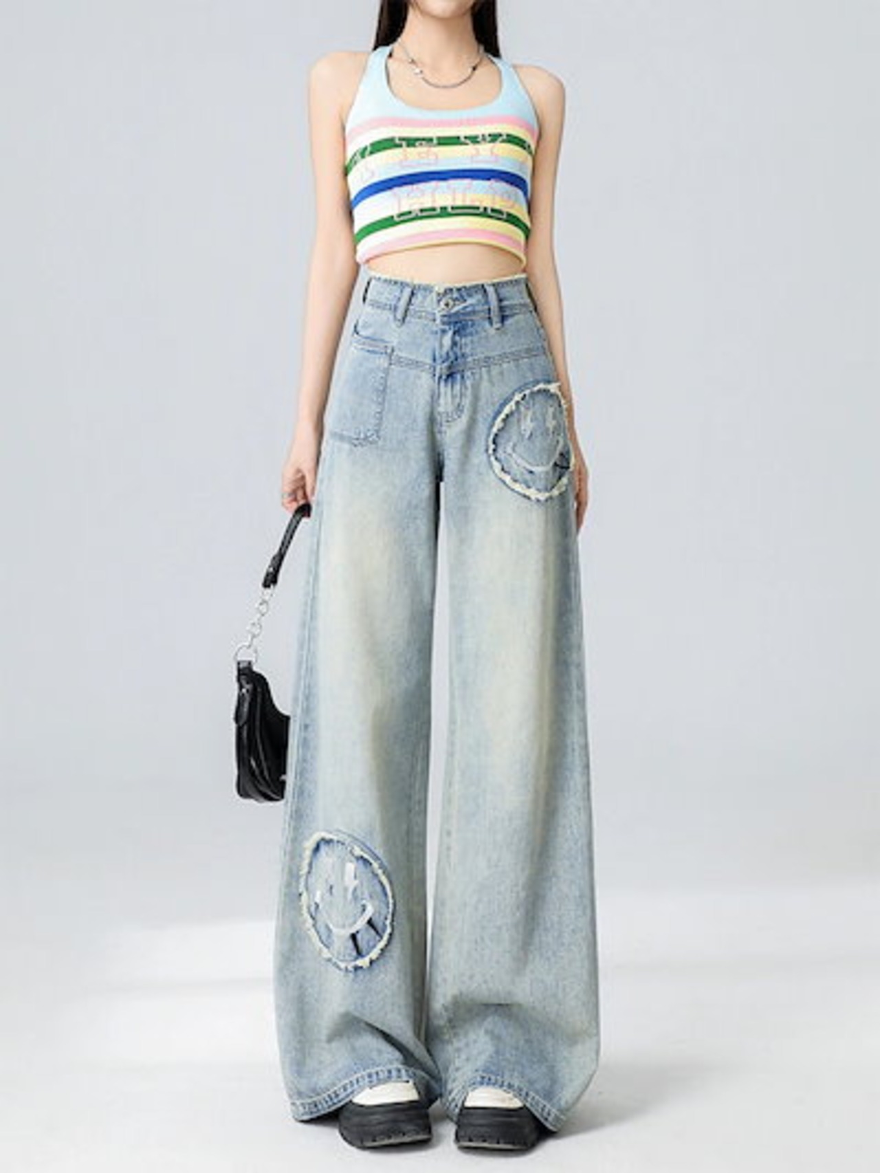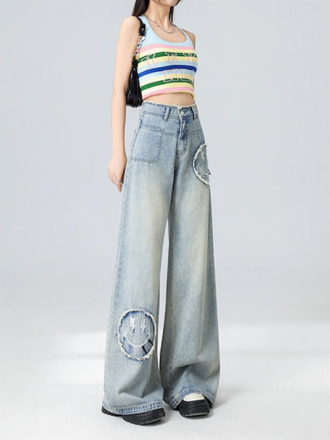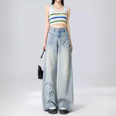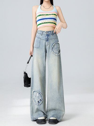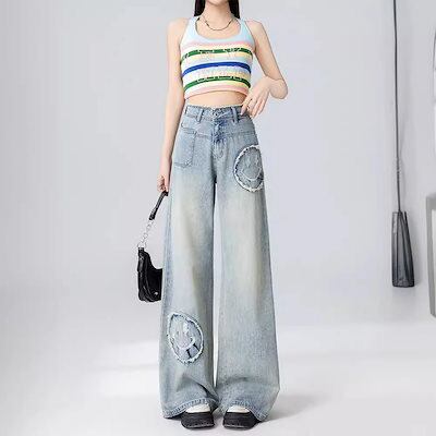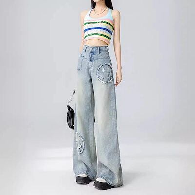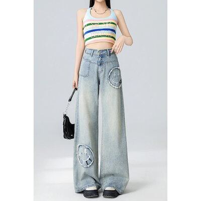 女性用刺繍パッチワイドジーンズ2024春ハイウエスト痩身トールストレートパンツ女性用