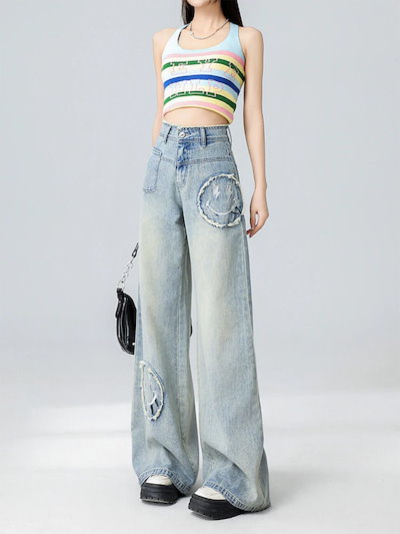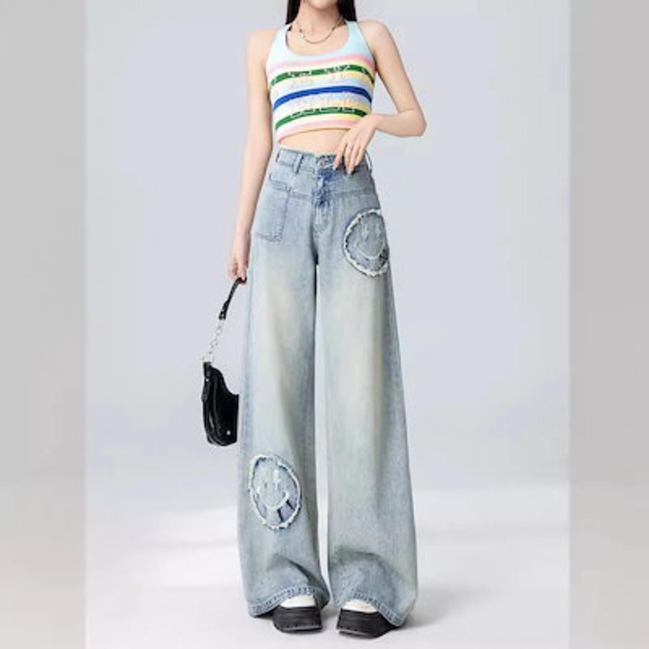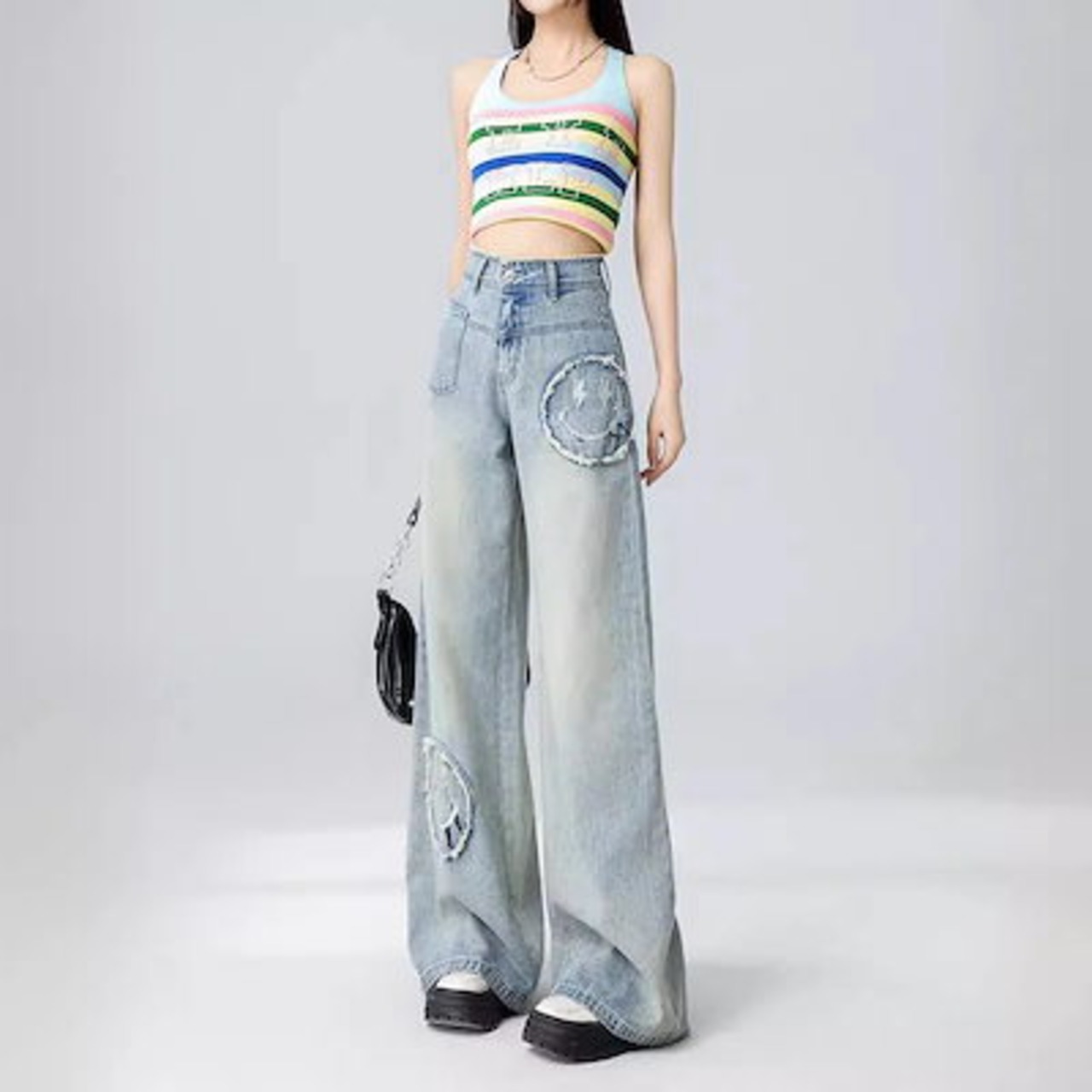女性用刺繍パッチワイドジーンズ2024春ハイウエスト痩身トールストレートパンツ女性用