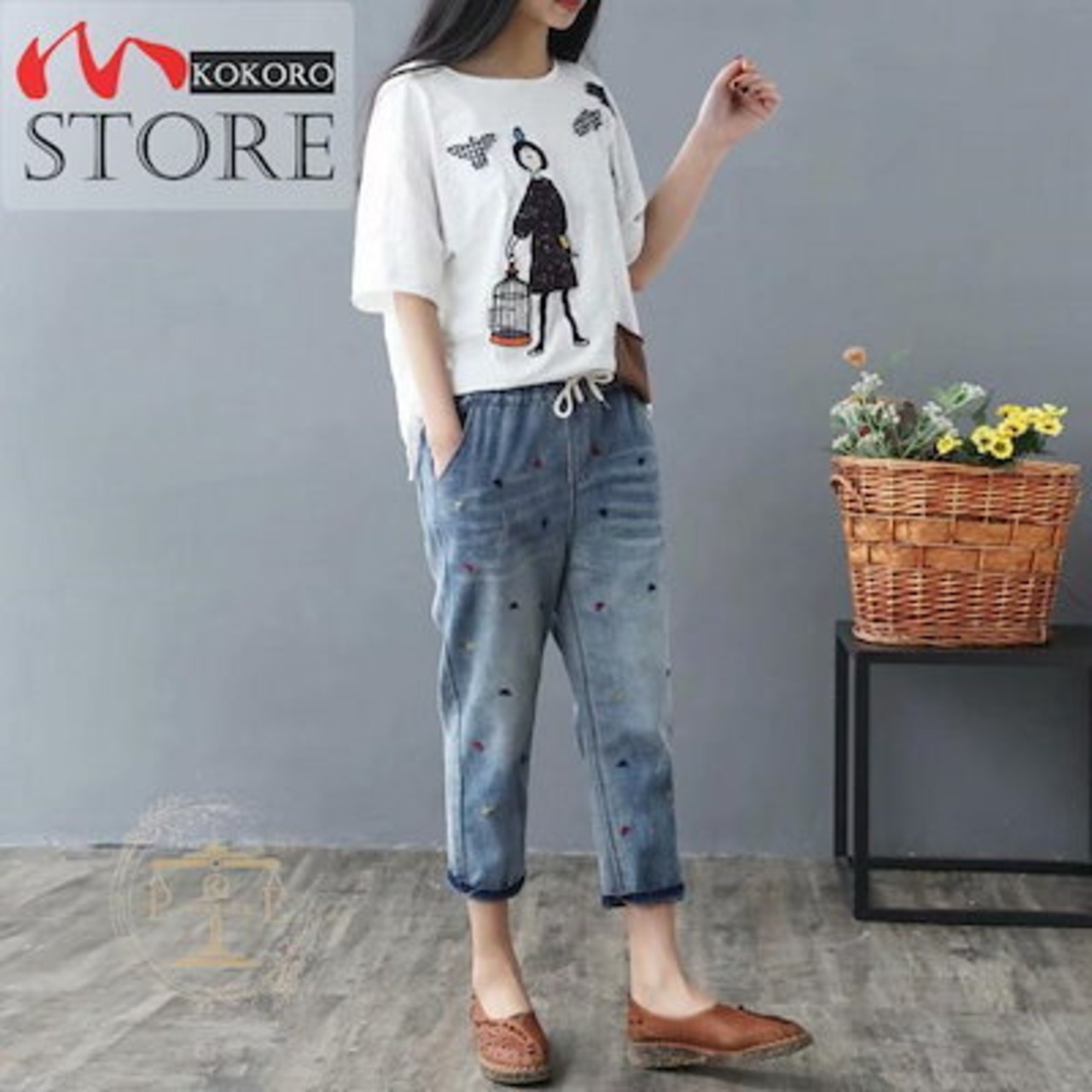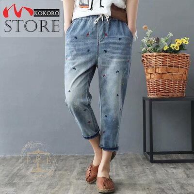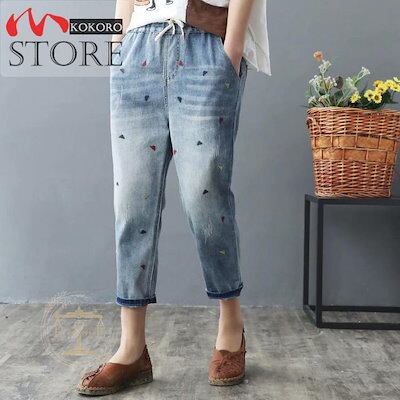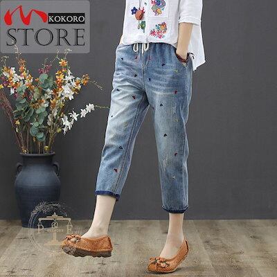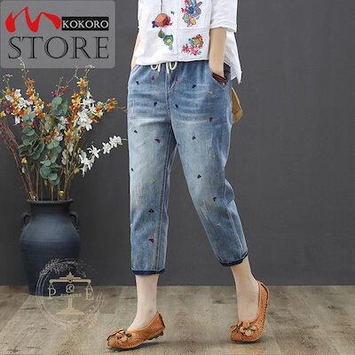 デニムパンツ レディース 春 七分丈パンツ ボトムス おしゃれ ワイドパンツ 刺繍 ゆったり ジーンズ 大きいサイズ
