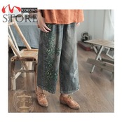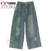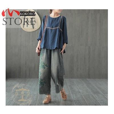 ロングパンツ レディース 春 ジーンズ デニムパンツ 刺繍 ゆったりパンツ ワイドパンツ 着痩せ おしゃれ