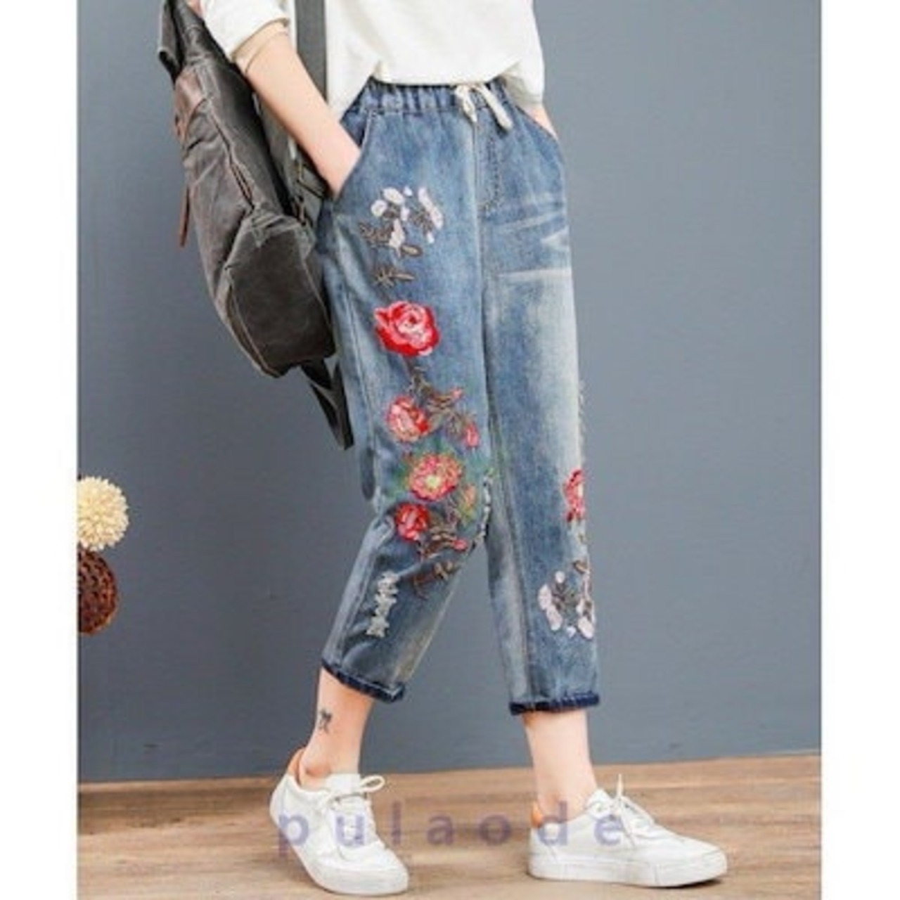 デニムクロップドパンツ花柄刺繍レディースデニムパンツ ジーパン春七分丈ジーンズ夏ダメージパンツ民族風ボトムス ズボン8分丈パンツ ジーンズ