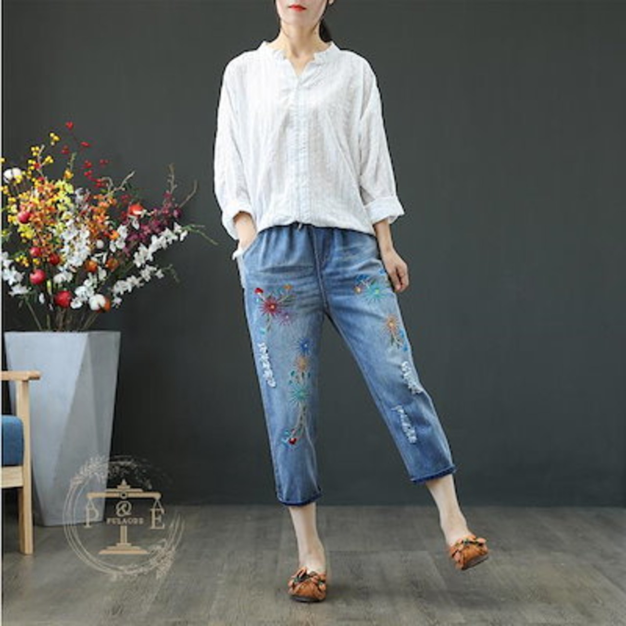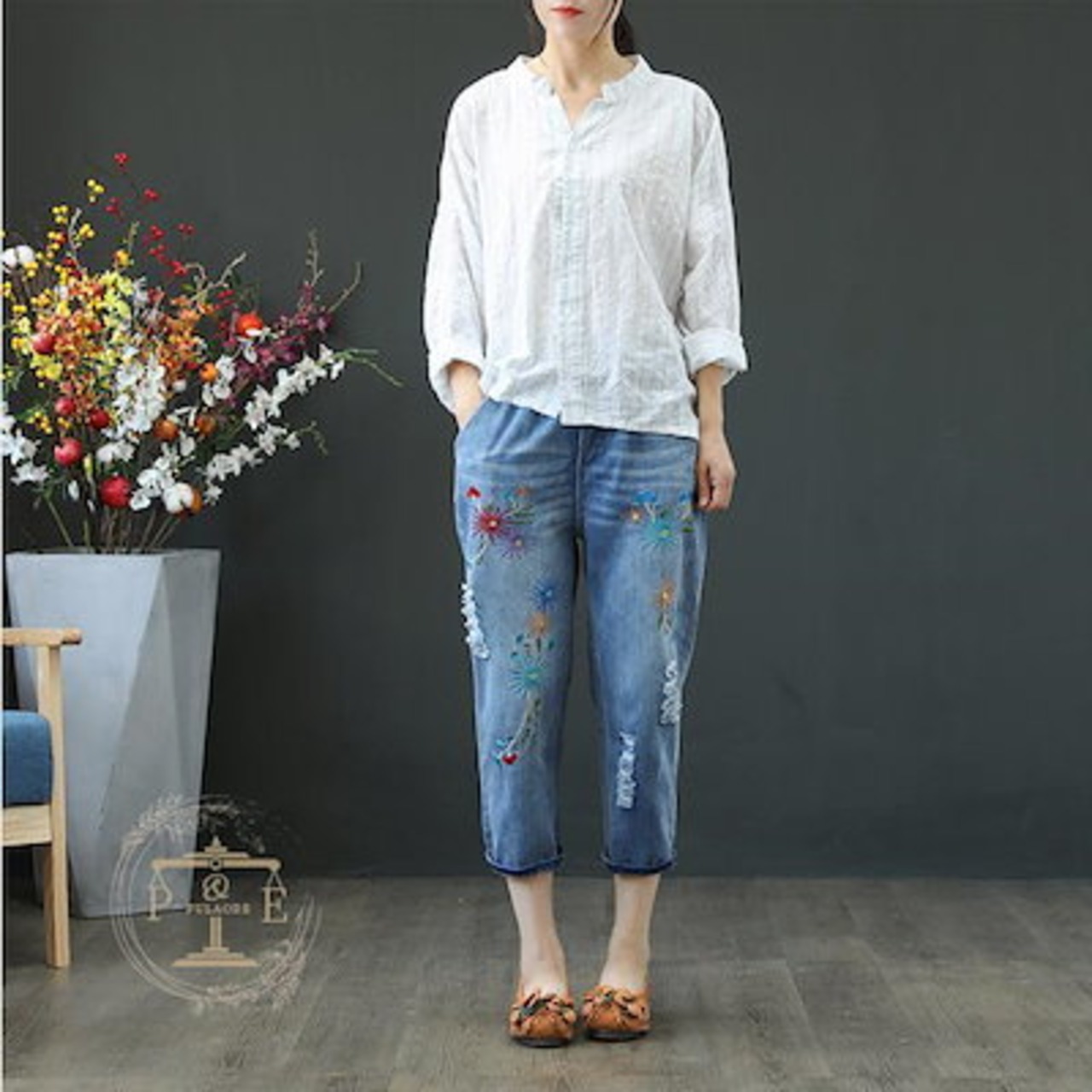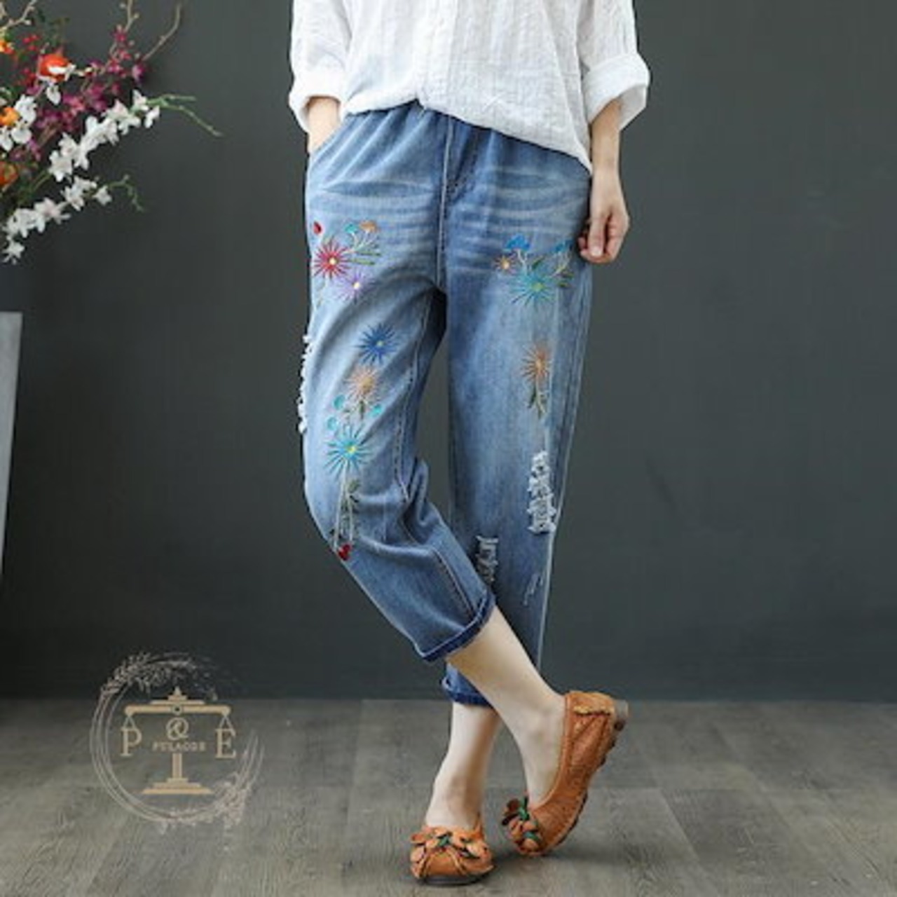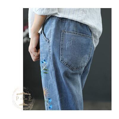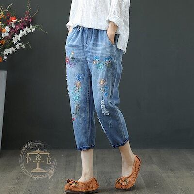ジーンズ レディース 刺繍 花 フラワー イージーパンツ 七分丈 クロップド デニムパンツ ウォッシュ ダメージ