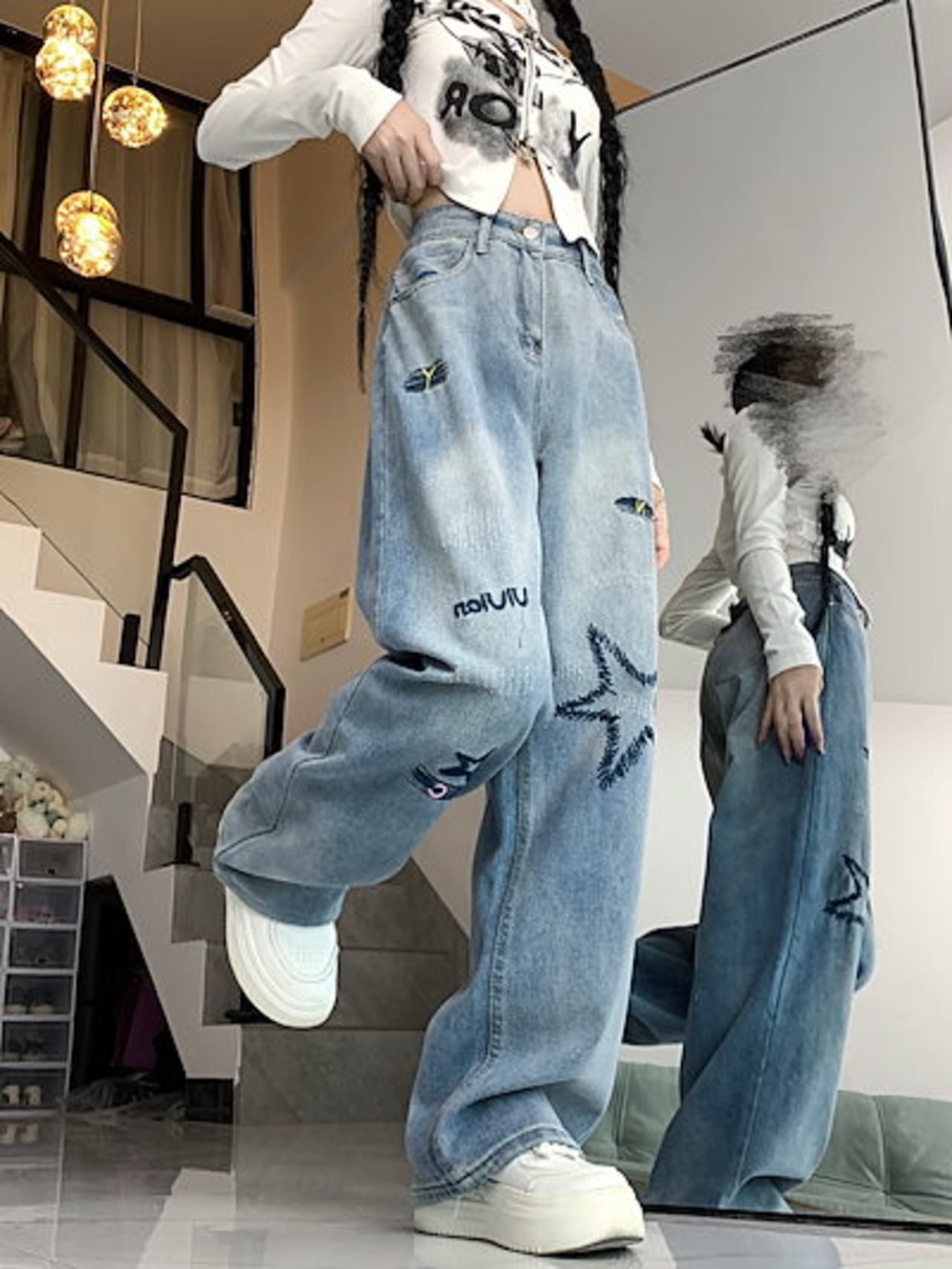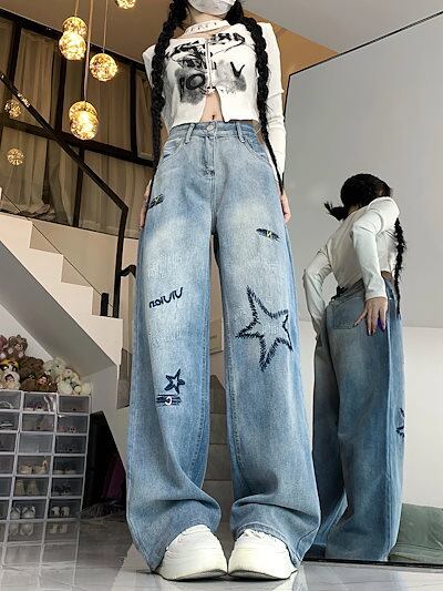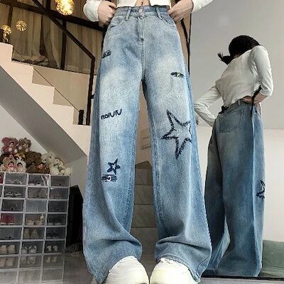 アメリカン刺繍デニムワイドパンツ秋冬の小人数デザイン感ハイウエスト百合ストレートカジュアルパンツ
