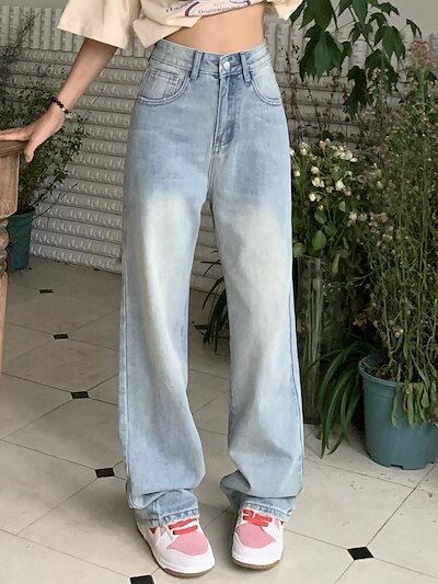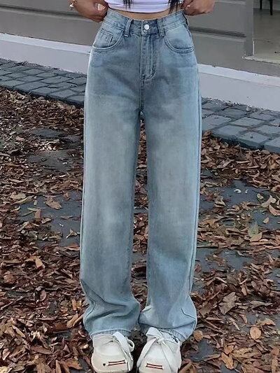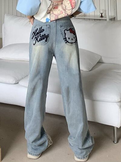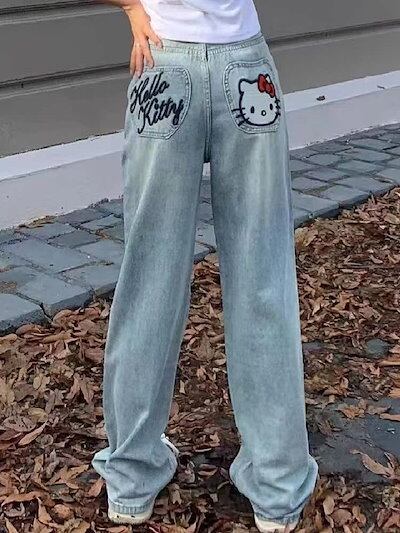 アニメ刺繍ジーンズ女性の秋冬型学生のハイウエストストレートワイドパンツブーム