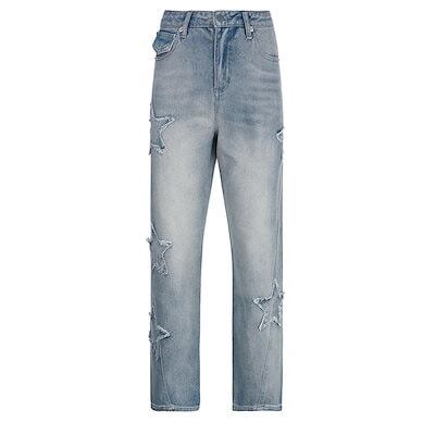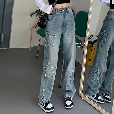 デザイン感 ジーンズ ハイウェスト カラー刺繍 ロングパンツ ストレート ジーンズ ペンタグラムスター カーゴパンツ