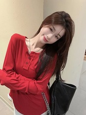 2024春夏トップス Tシャツ 長袖 ラウンドネック ボタン 薄手 ゆったり 細見え 夏 白 赤 おしゃれ かわいい 韓国ファッション レディース お出かけ