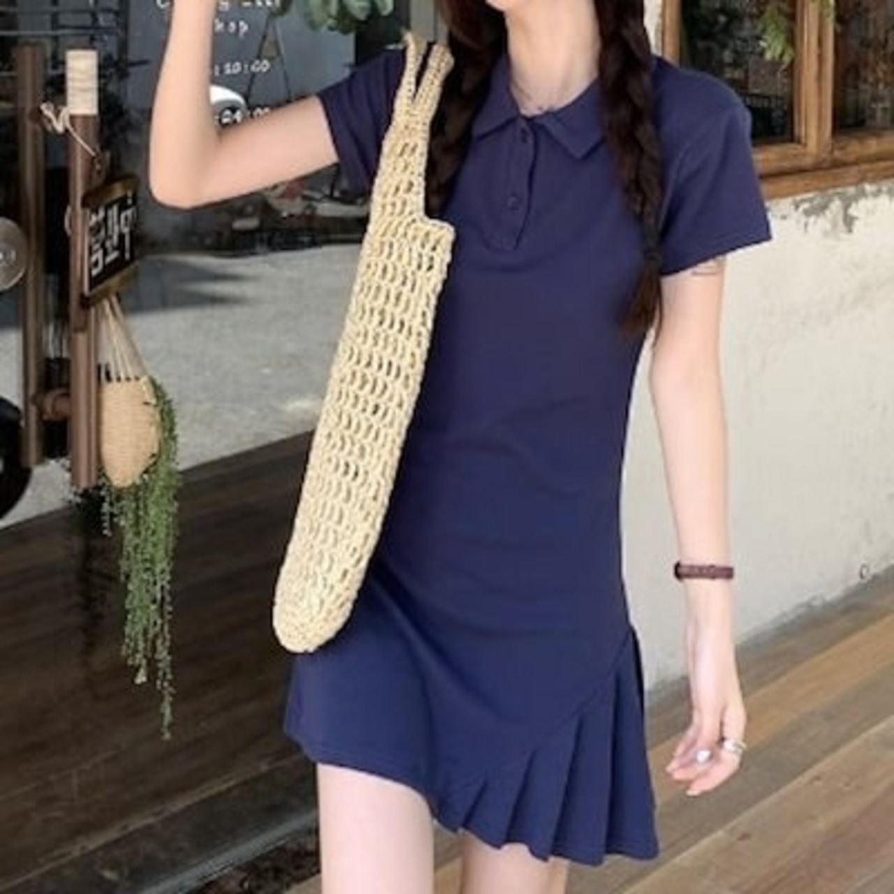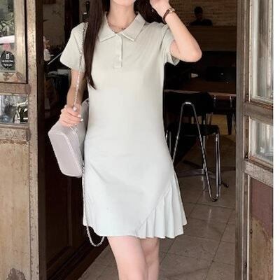 2024 春夏ワンピース ミニ丈 ポロネック 半袖 プリーツ アシンメトリー Aライン 細見え 夏 おしゃれ かわいい ガーリー キュート 甘め 緑 韓国ファッション レディース お出かけ
