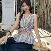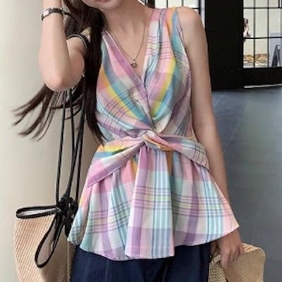 2024夏トップス ツイストシャツ Vネック チェック柄 ノースリーブ ゆったり 細見え 夏 カラフル ピンク おしゃれ かわいい キュート ガーリー 甘め 韓国ファッション レディース お出かけ
