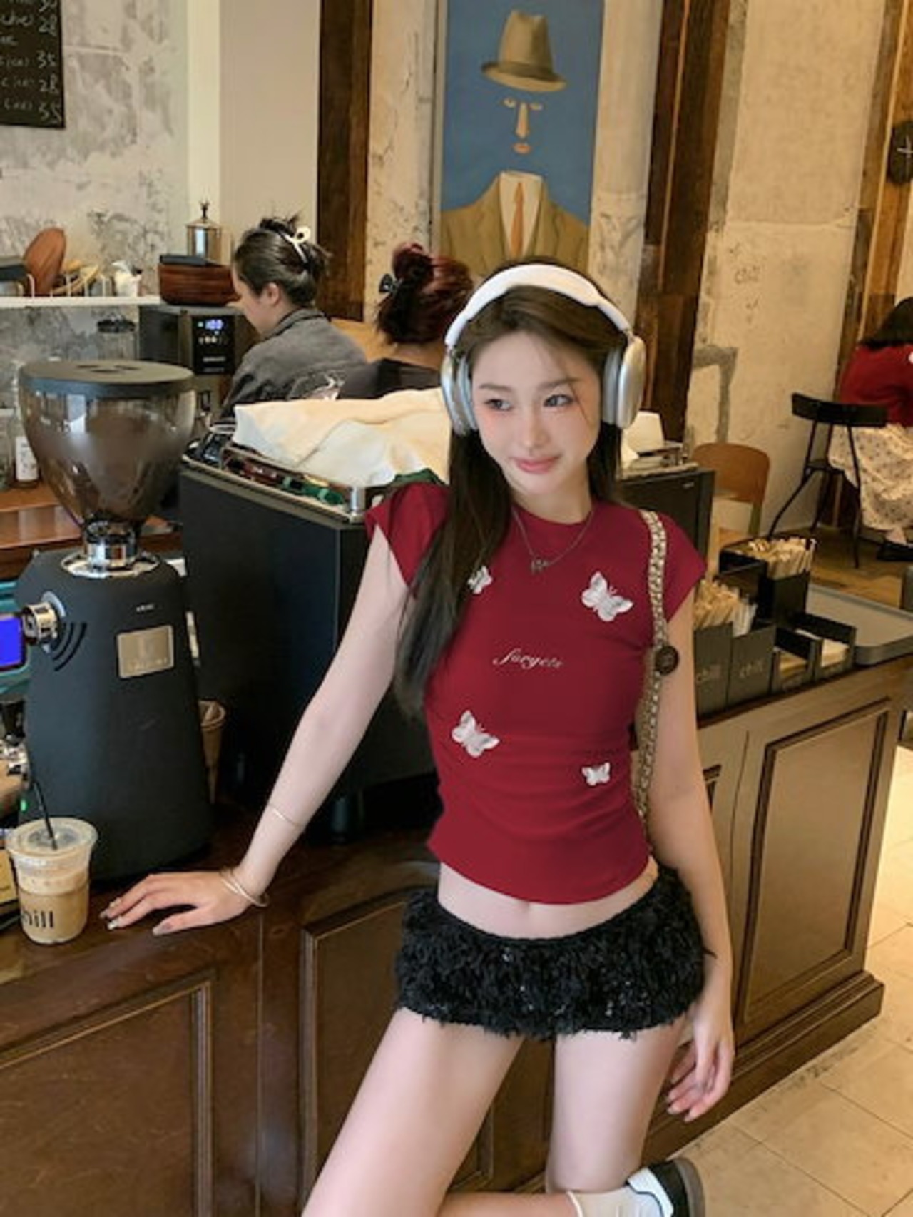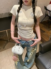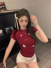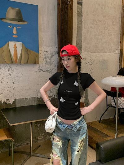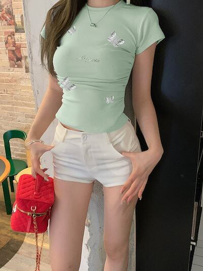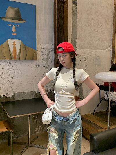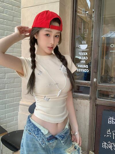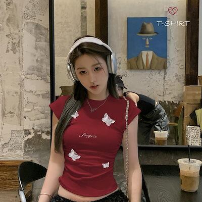2024 夏 韓国トップス プリント半袖 Tシャツ 韓国 ラウンドネック スリム かわいいへそ出し 白ショート おしゃれスリーブ カジュアルセットアップコーデ丈 ファッションレディースフレンチお出かけ