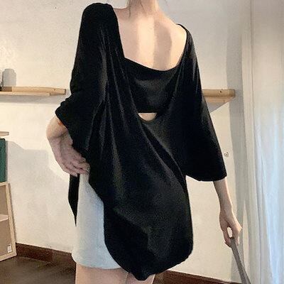 2024夏 韓国トップス シャツ 五分袖 バックオープン ゆったり 細見え 夏 白 黒 大人っぽい おしゃれ かわいい 韓国ファッション レディース お出かけ