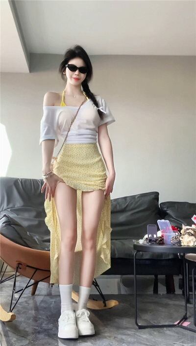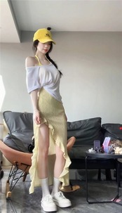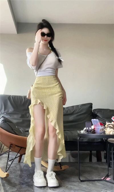 2024 春夏スカート ミモレ丈 Aライン 台形 スリット フリル ハイウエスト 美脚効果 脚長効果 細見え 夏 黄色 イエロー おしゃれ かわいい 韓国ファッション レディース お出かけ