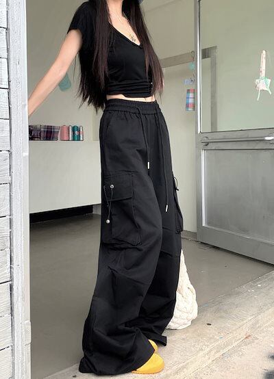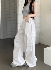 2024春夏パンツ ロング丈 ポケット ワイド ストレート ウエストゴム ハイウエスト 美脚効果 脚長効果 細見え 夏 白 黒 おしゃれ かわいい 韓国ファッション レディース お出かけ
