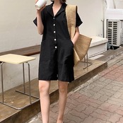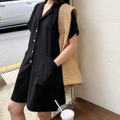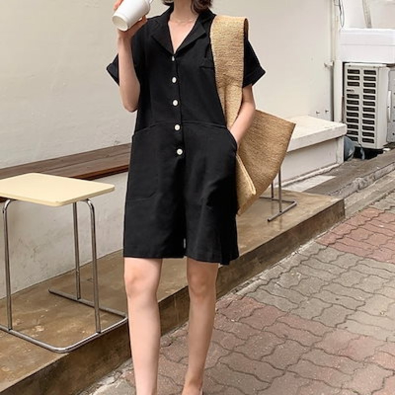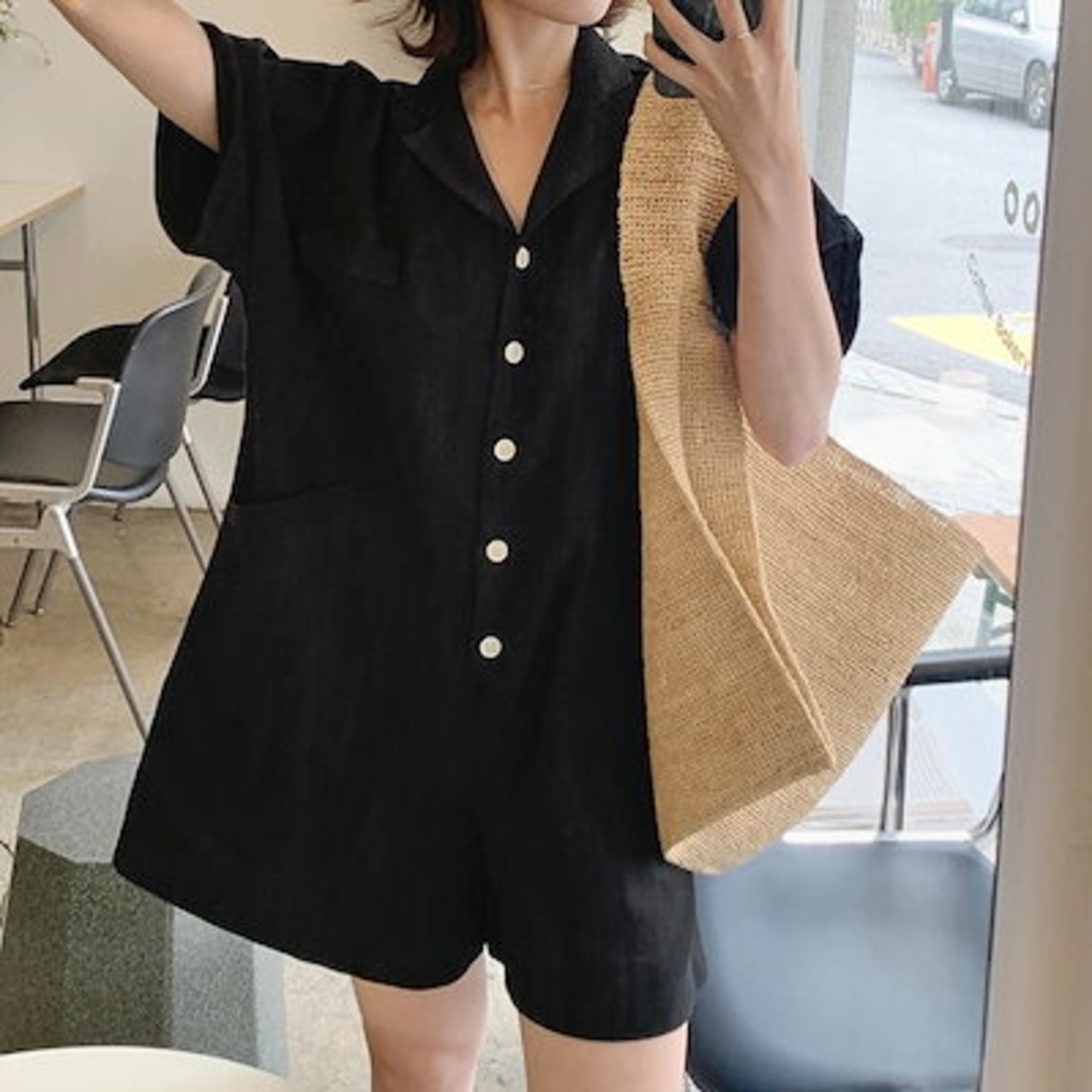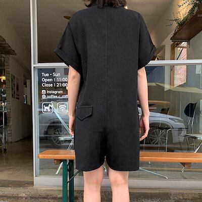 2024夏 韓国オールインワン Vネック ボタン 半袖 ポケット ハーフパンツ 細見え 夏 黒 ブラック おしゃれ かわいい 韓国ファッション レディース お出かけ