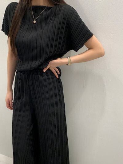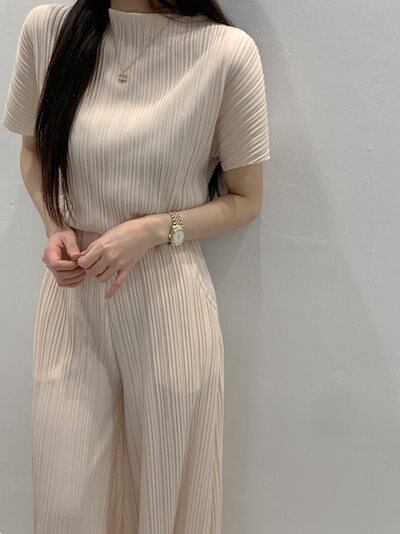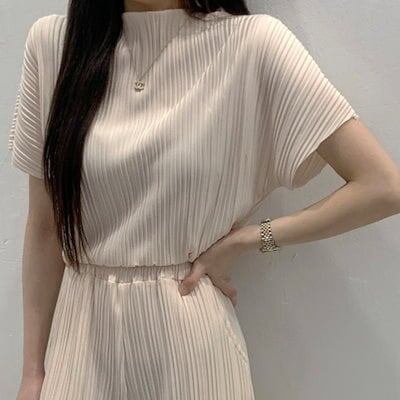 2024夏 韓国セットアップ トップス モックネック 半袖 ロングパンツ ワイド ストレート 細見え 夏 黒 白 おしゃれ かわいい きれいめ 韓国ファッション レディース お出かけ