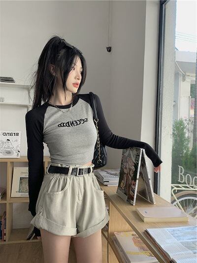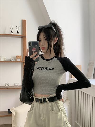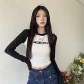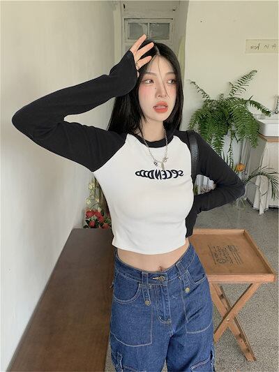 2024夏 韓国 トップス 長袖 可愛い おしゃれ タイトフィット カットソー ラウンドカラー 重ね着丈 スリーブ 女っぽ レディース Tファッション系 フェミニン きれいめ 色っぽ プリント