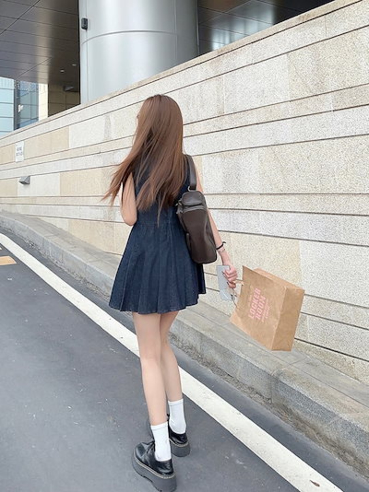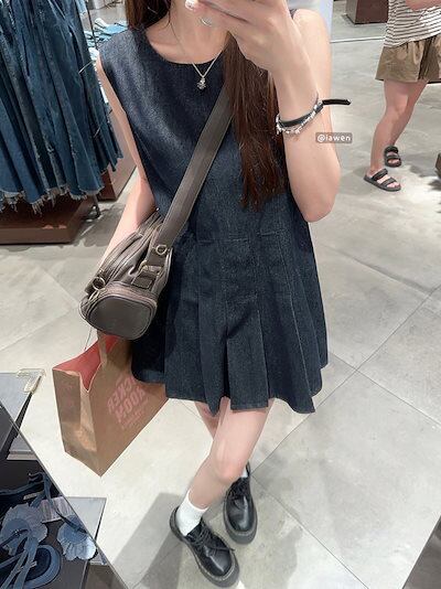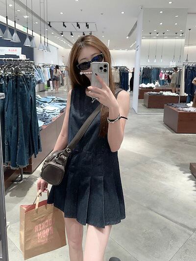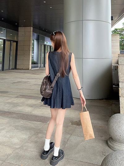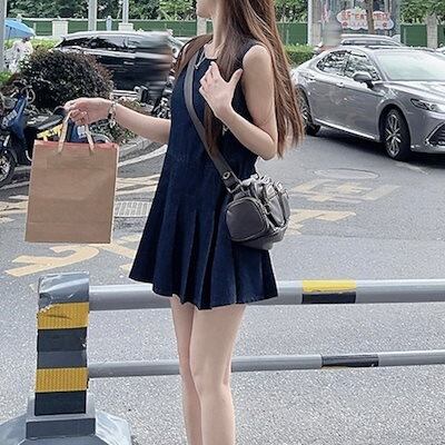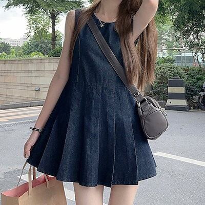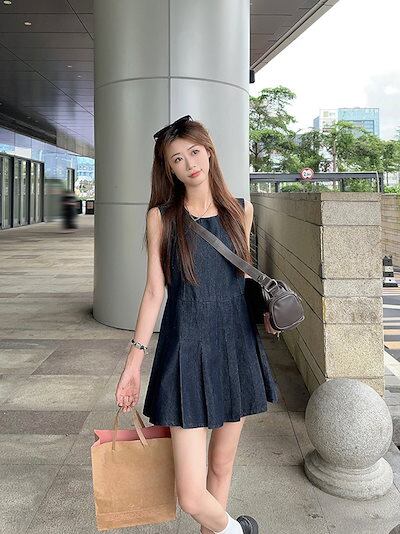 2024 春夏ワンピース ノースリーブ ラウンドネック ミニ丈 Aライン レトロ デニム生地 プリーツ 細見え 夏 おしゃれ かわいい 甘め キュート ラブリー 韓国ファッション レディース お出かけ