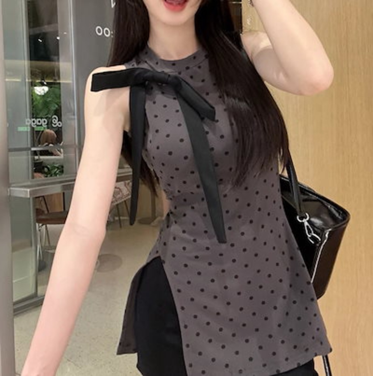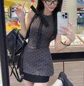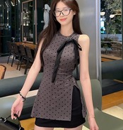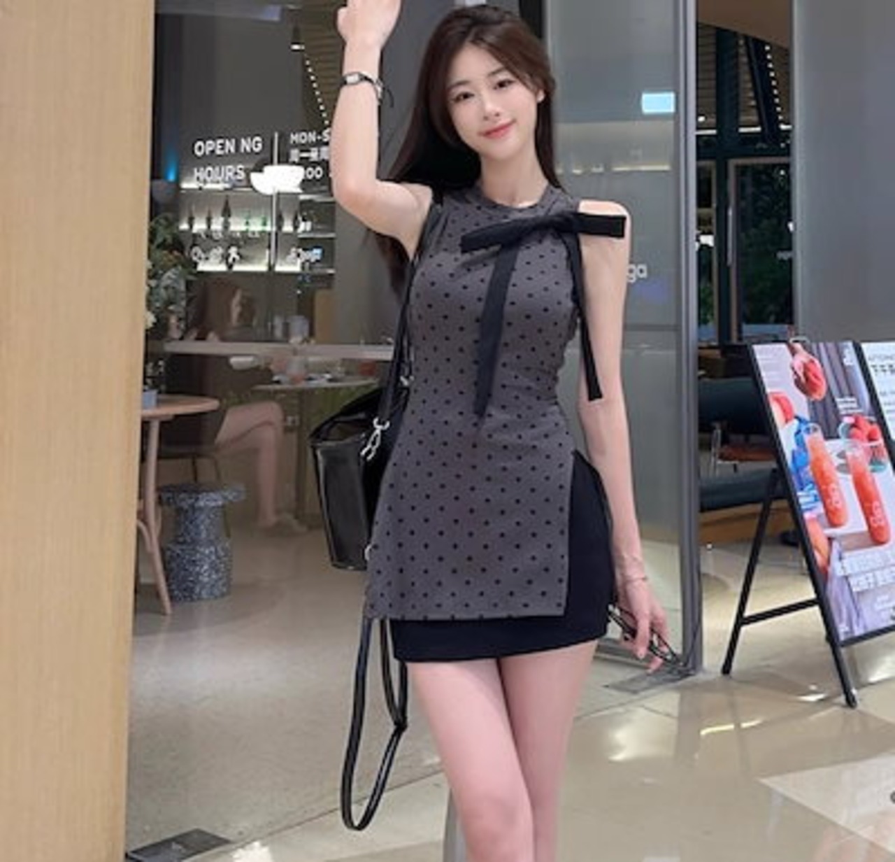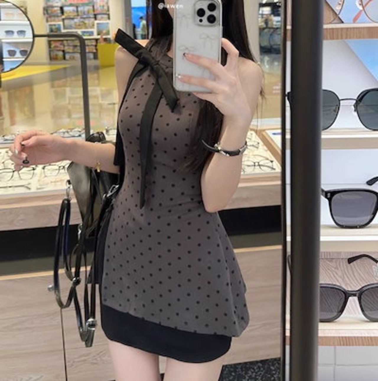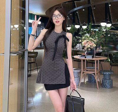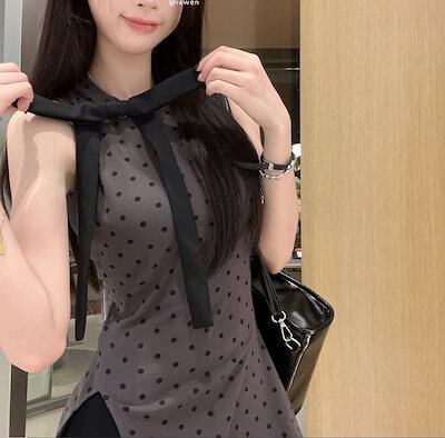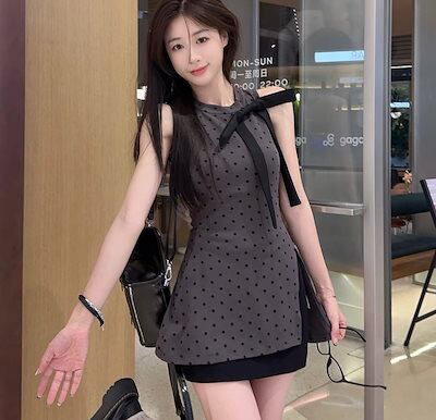 2024 夏 韓国ワンピース ミニ丈 デニム生地 ラウンドネック ノースリーブ リボン プリント Aライン 細見え 夏 ブルー 青 カジュアル おしゃれ かわいい キュート 韓国ファッション レディー