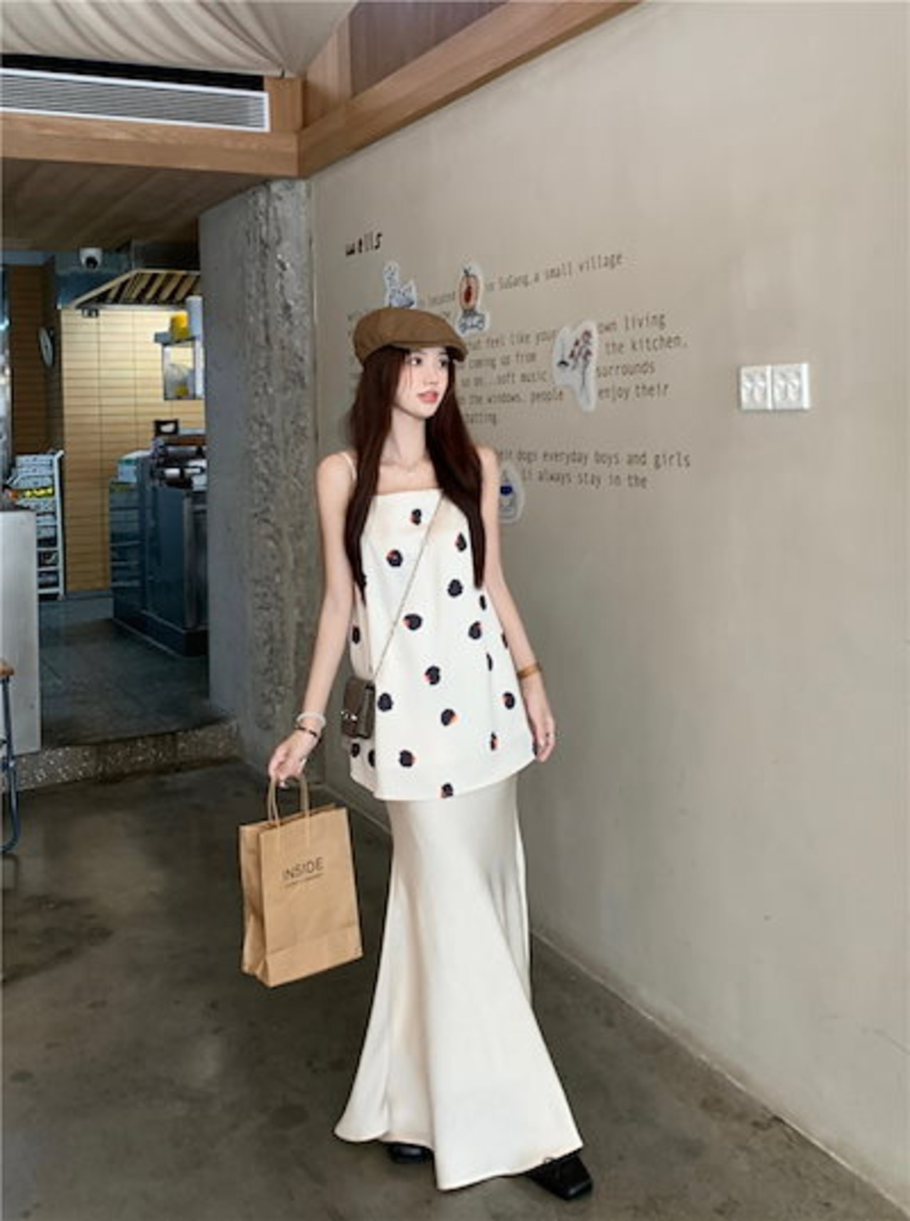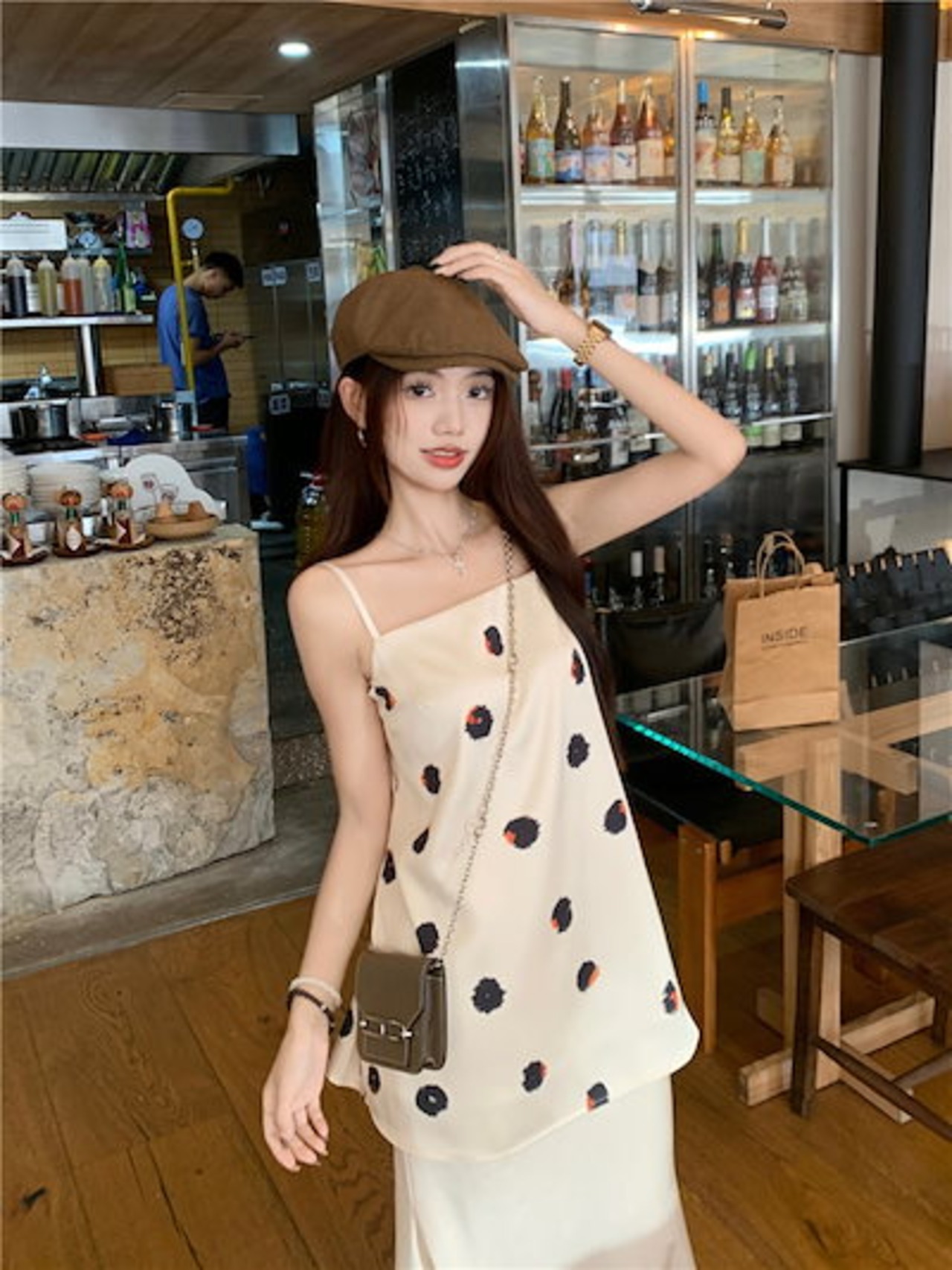 2024 春夏トップス キャミソール ノースリーブ スクエアネック ドット柄 丈長め ゆったり 細見え 夏 白 ホワイト おしゃれ かわいい 韓国ファッション レディース お出かけ