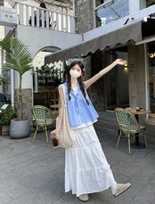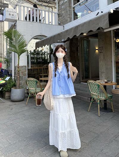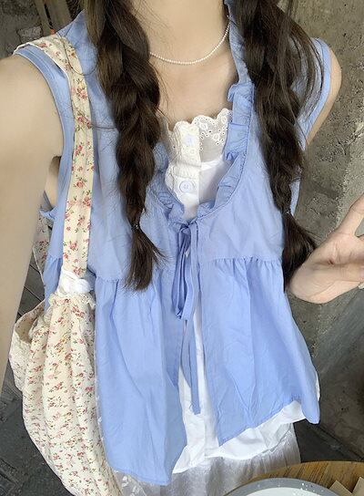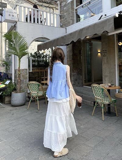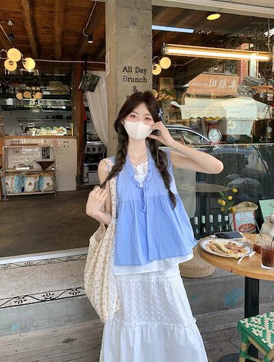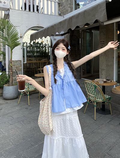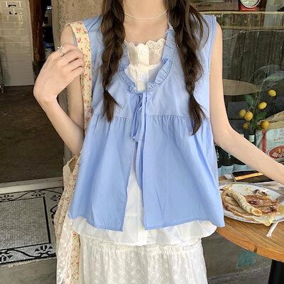 2024 春夏トップス シャツ ノースリーブ ゆったり 細見え 夏 青 ブルー 爽やか ガーリー キュート 甘め おしゃれ かわいい 韓国ファッション レディース お出かけ