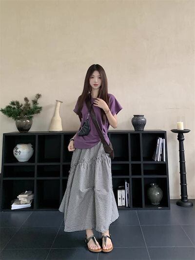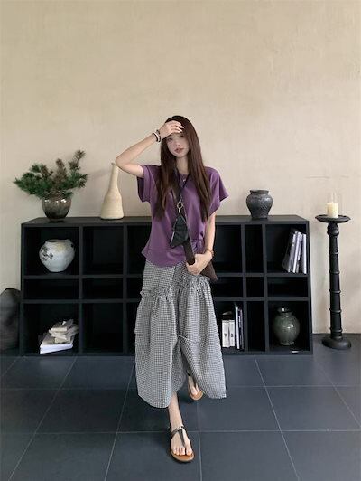2024 春夏スカート ミモレ丈 フレア Aライン ギンガムチェック 黒 ブラック ハイウエスト 美脚効果 脚長効果 細見え 夏 おしゃれ かわいい 韓国ファッション レディース お出かけ