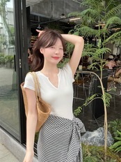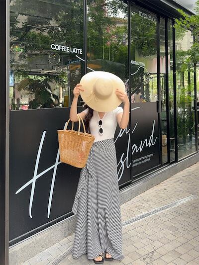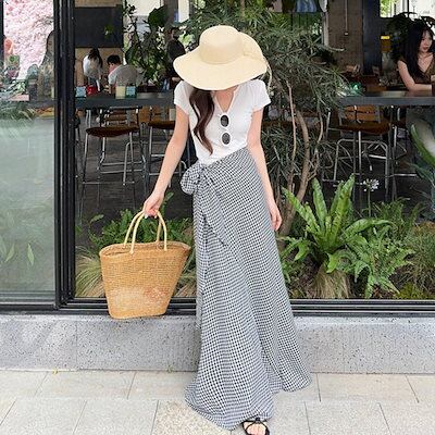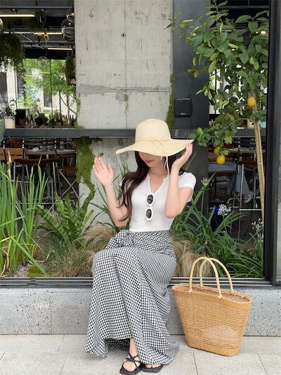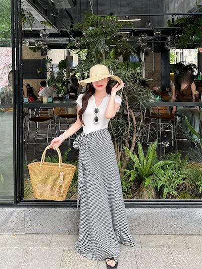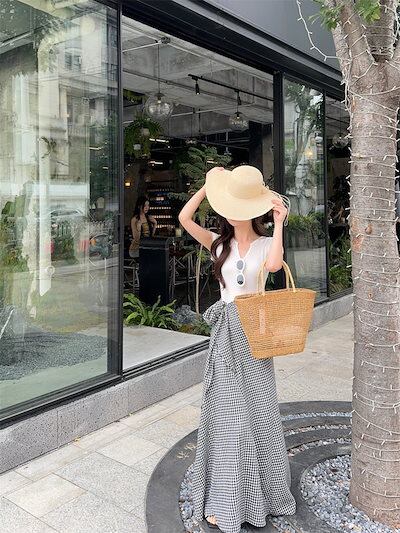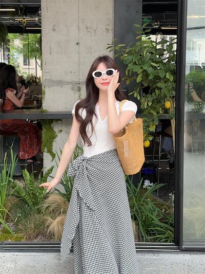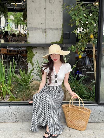 2024夏 韓国VネックTシャツ×チェック柄スカートセット
