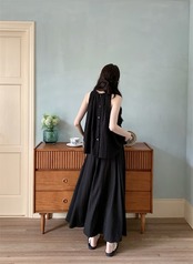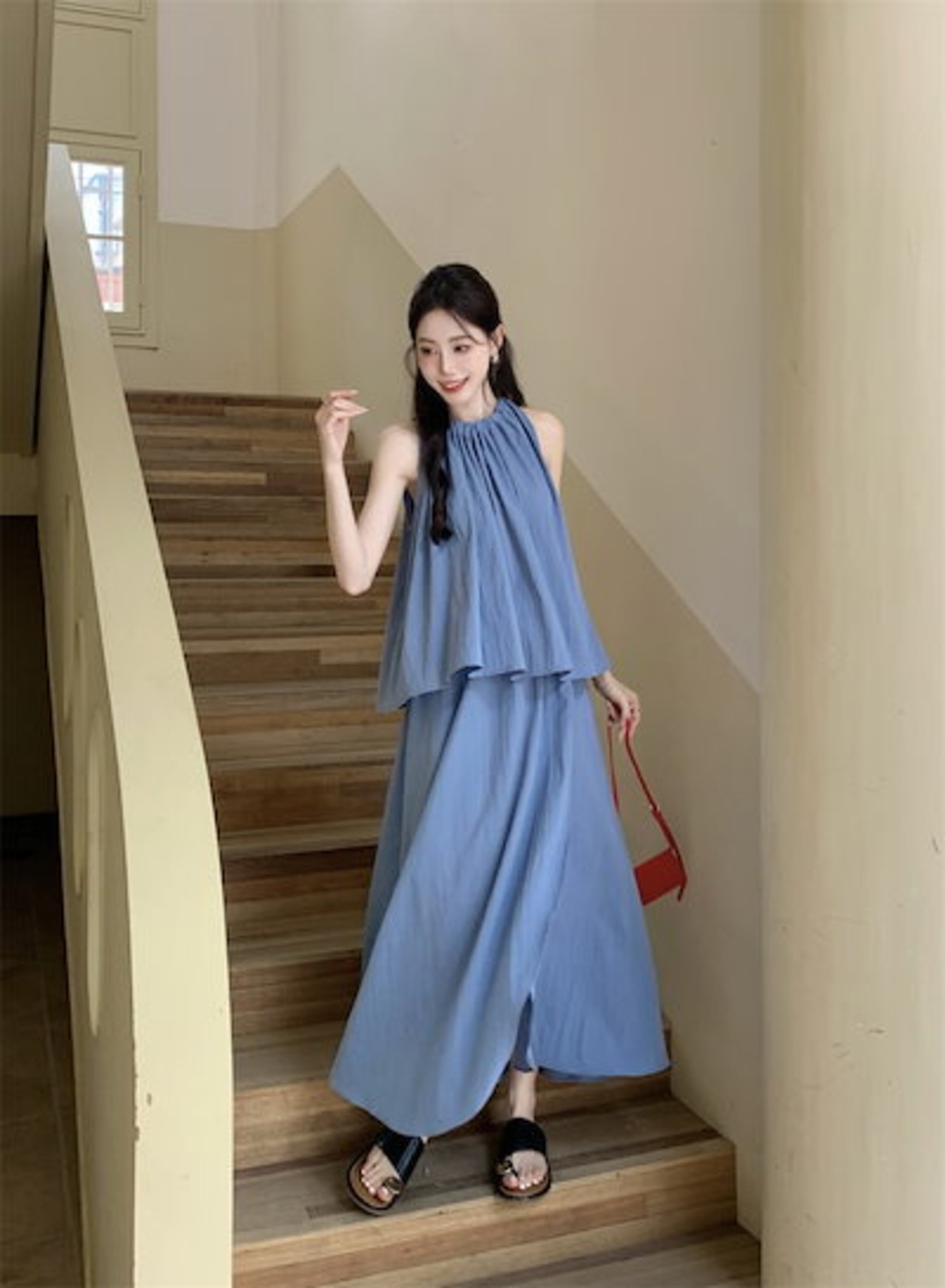 2024夏 韓国セットアップ シャツ ホルターネック ノースリーブ スカート ロング丈 Aライン ゆったり 細見え 夏 青 黒 きれいめ おしゃれ かわいい 韓国ファッション レディース お出かけ