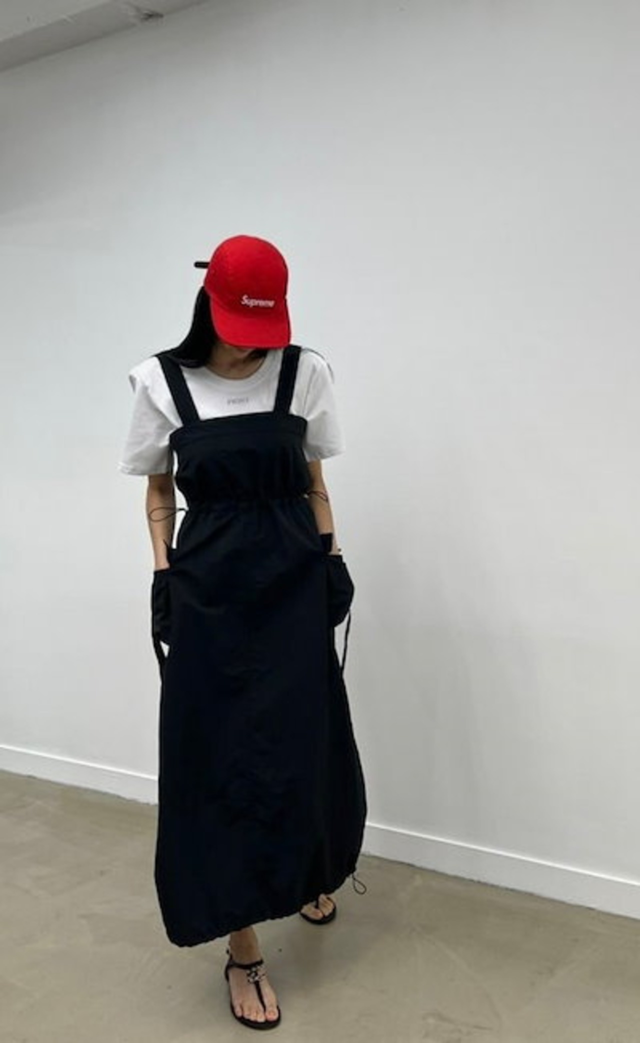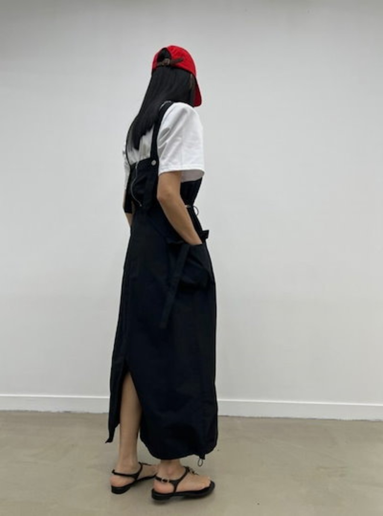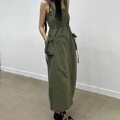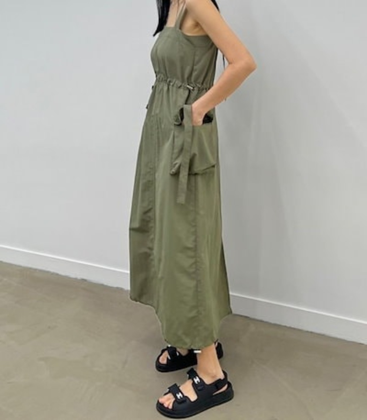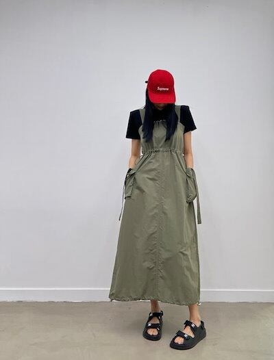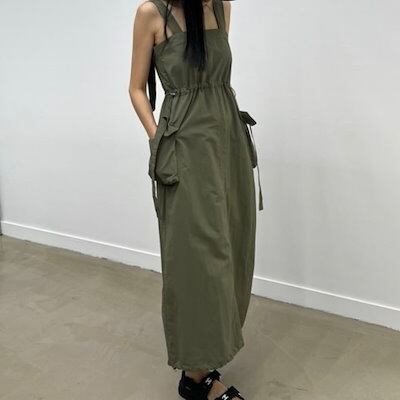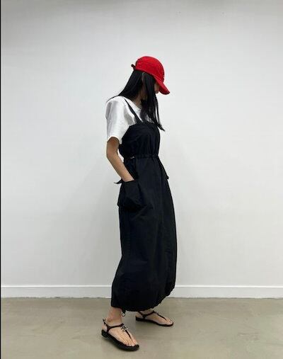 2024春夏セットアップ ジャンパースカート ジャンスカ ミモレ丈 スクエアネック ノースリーブ Aライン スリット バックオープン ゆったり 細見え 夏 黒 緑 おしゃれ かわいい 韓国ファッション