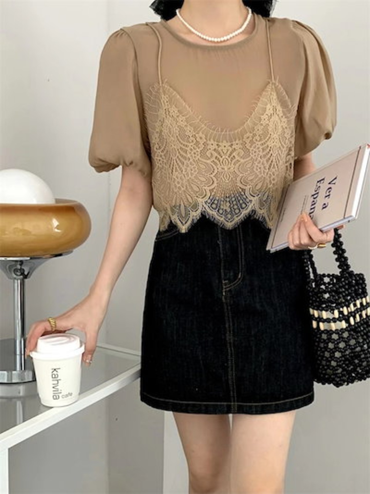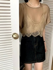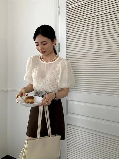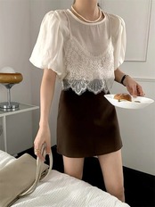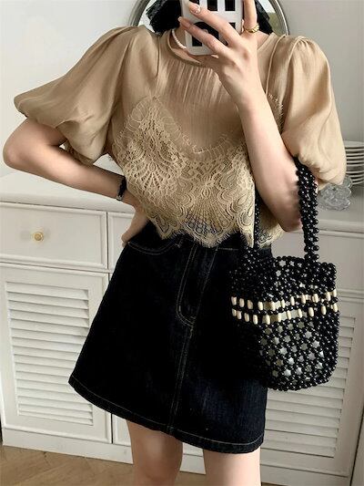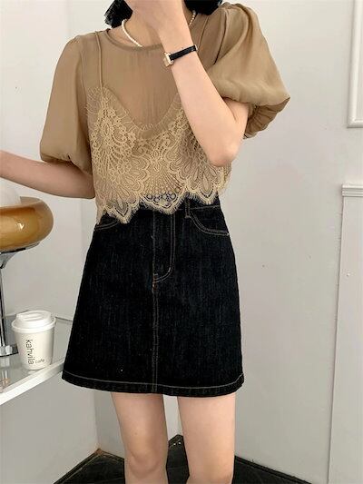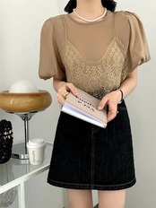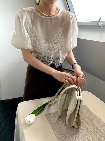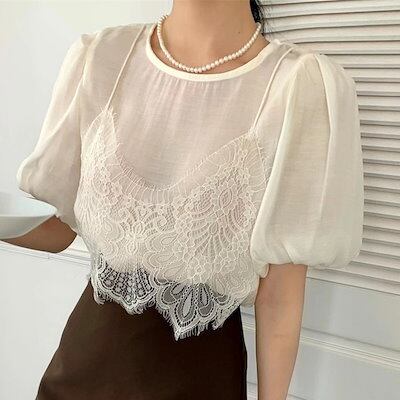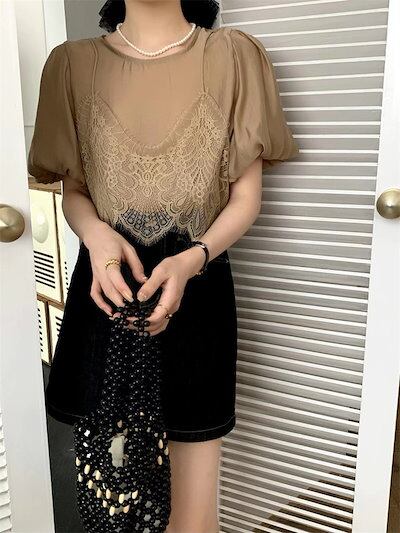 2024 春夏トップス Tシャツ レース キャミソール 半袖 バブル袖 二枚重ね 重ね着 ゆったり 細見え 夏 白 茶色 カジュアル おしゃれ かわいい 韓国ファッション レディース お出かけ