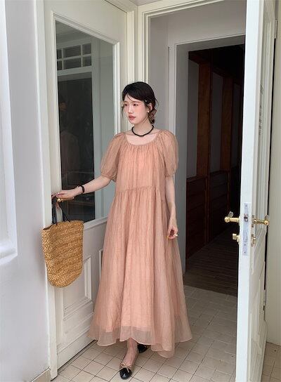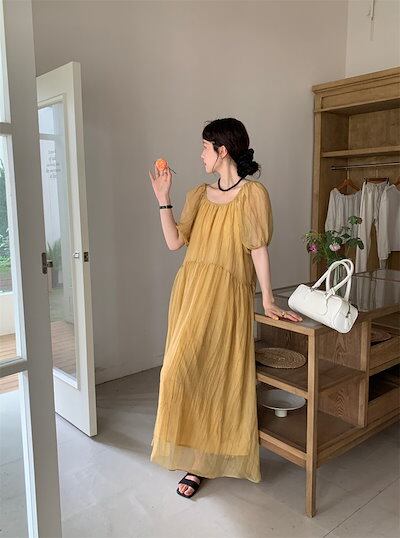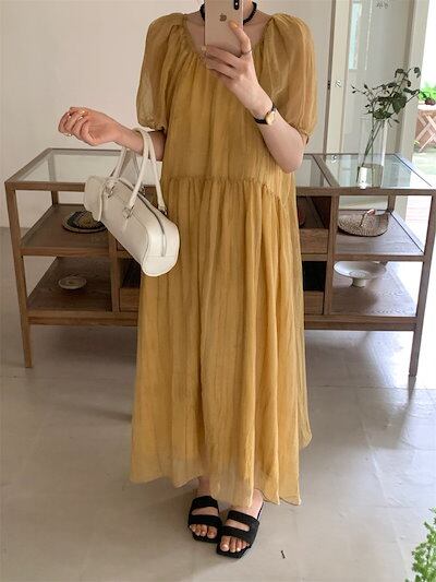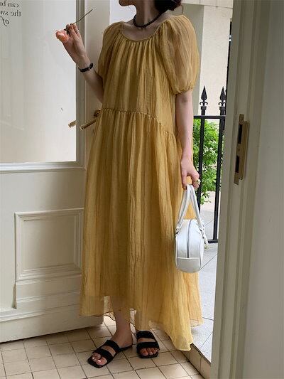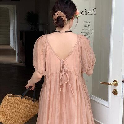 2024 春夏ワンピース ロング丈 半袖 バブル袖 バックオープン Aライン リボン ゆったり 細見え 夏 黄色 カジュアル おしゃれ かわいい キュート 韓国ファッション レディース お出かけ