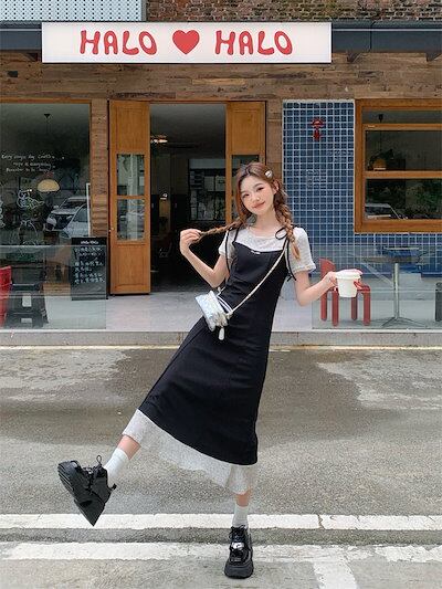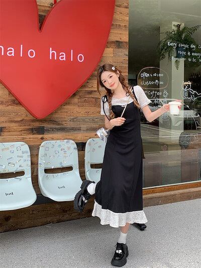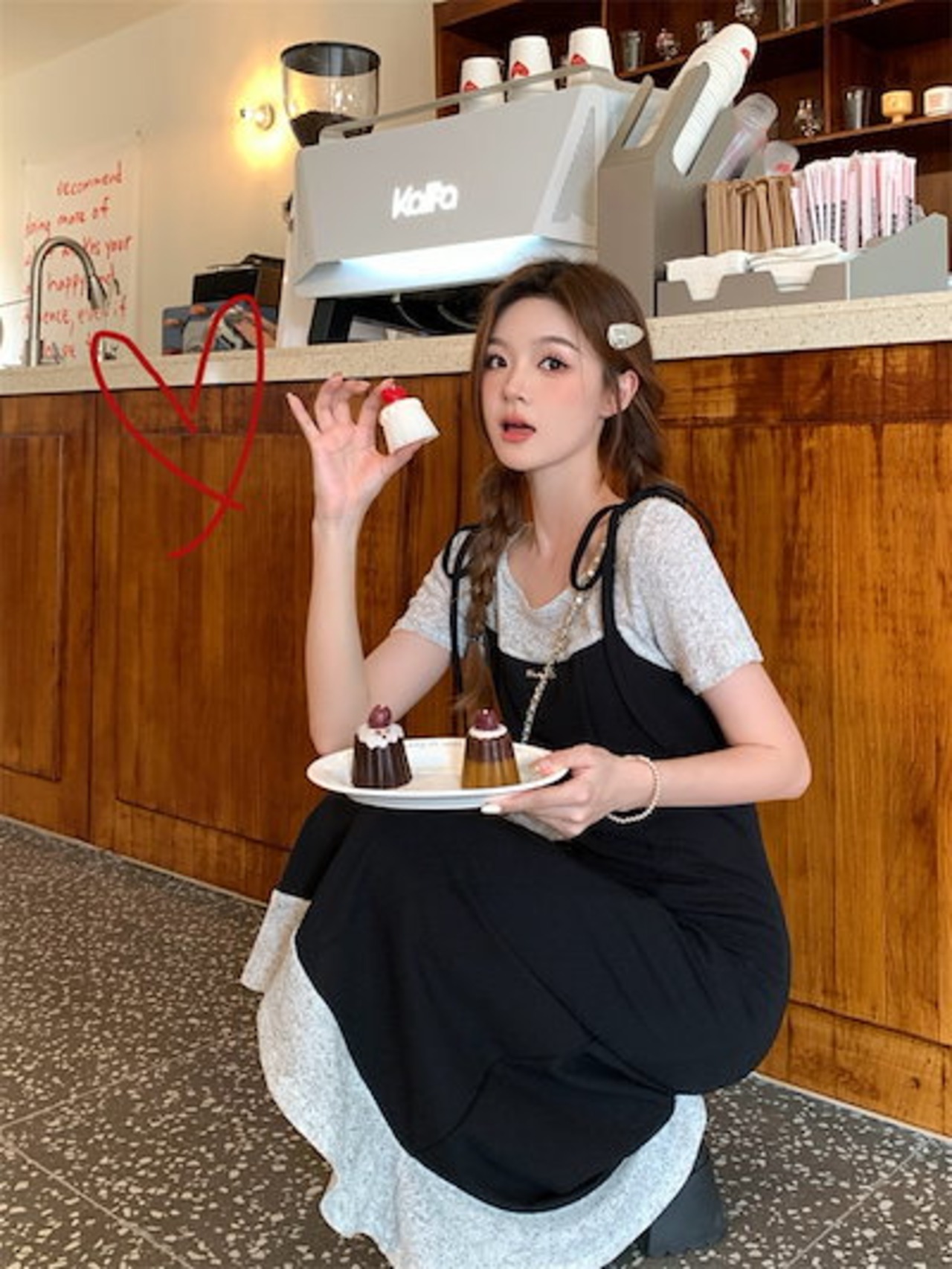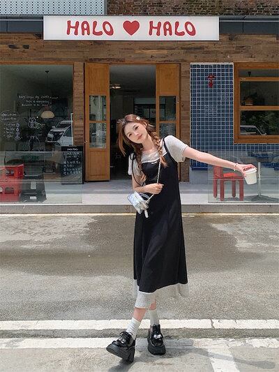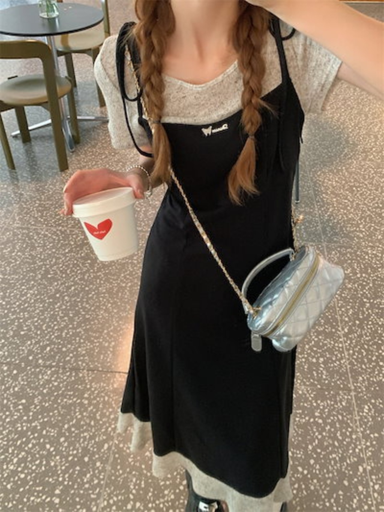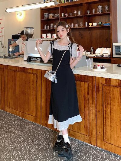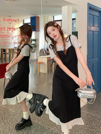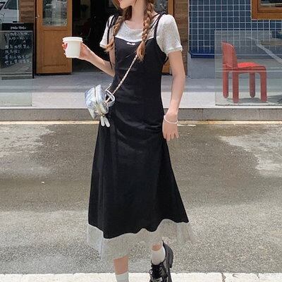 2024 春夏ワンピース ミディアム丈 2枚重ね風 半袖 キャミソール ラウンドネック Aライン リボン ゆったり 細見え 夏 カジュアル おしゃれ かわいい キュート 韓国ファッション レディース